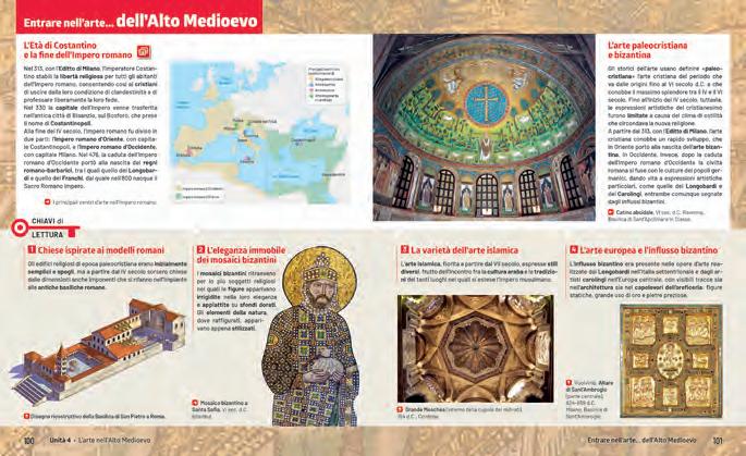 Una doppia pagina che cattura l’attenzione per inquadrare subito il tema e avere i giusti riferimenti spazio-temporali, grazie alla linea del tempo sulla quale scorrono gli eventi storici e le opere più rappresentative per un primo apprendimento attraverso le immagini.