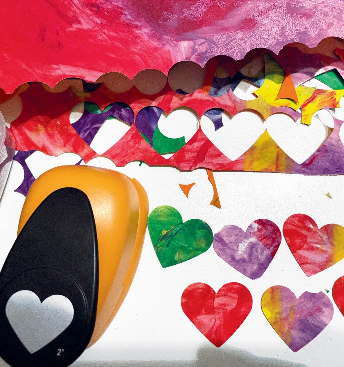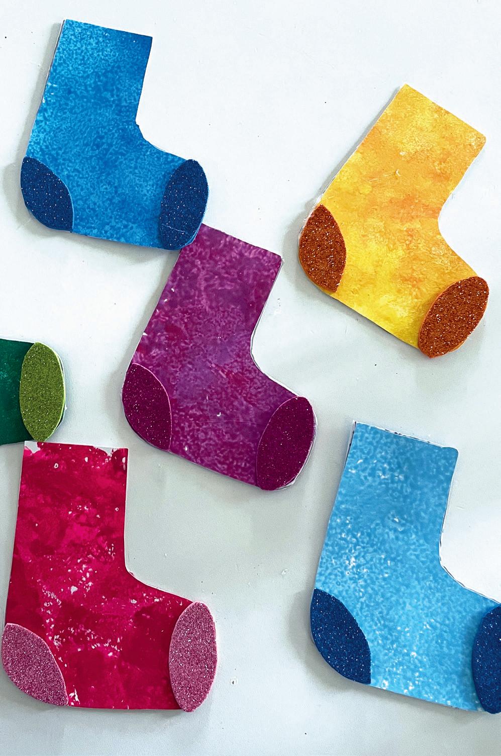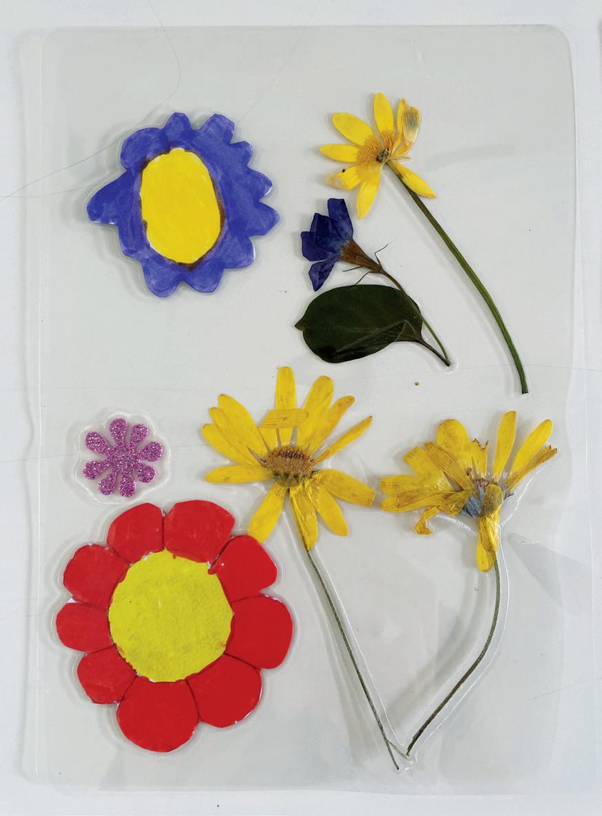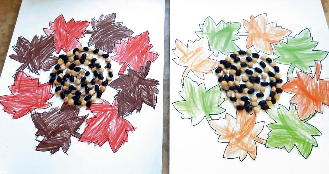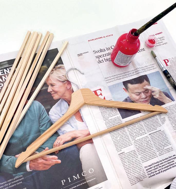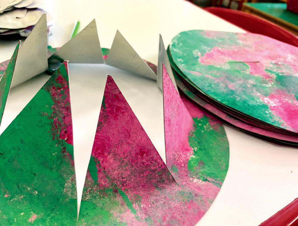 2 Una volta asciutto fissiamo qua e là alcune foglie ritagliate dai cartoni di scarto precedentemente dipinti.