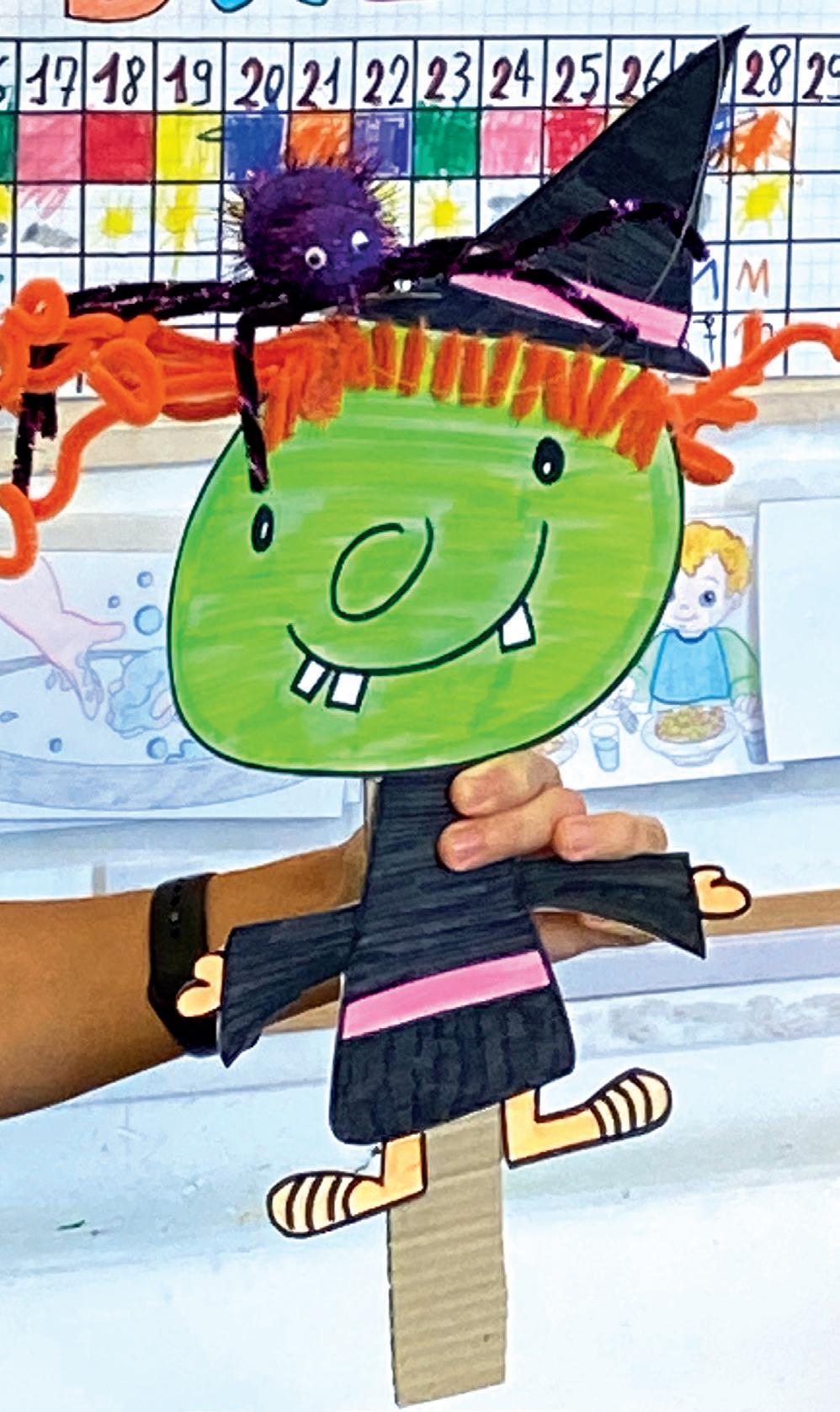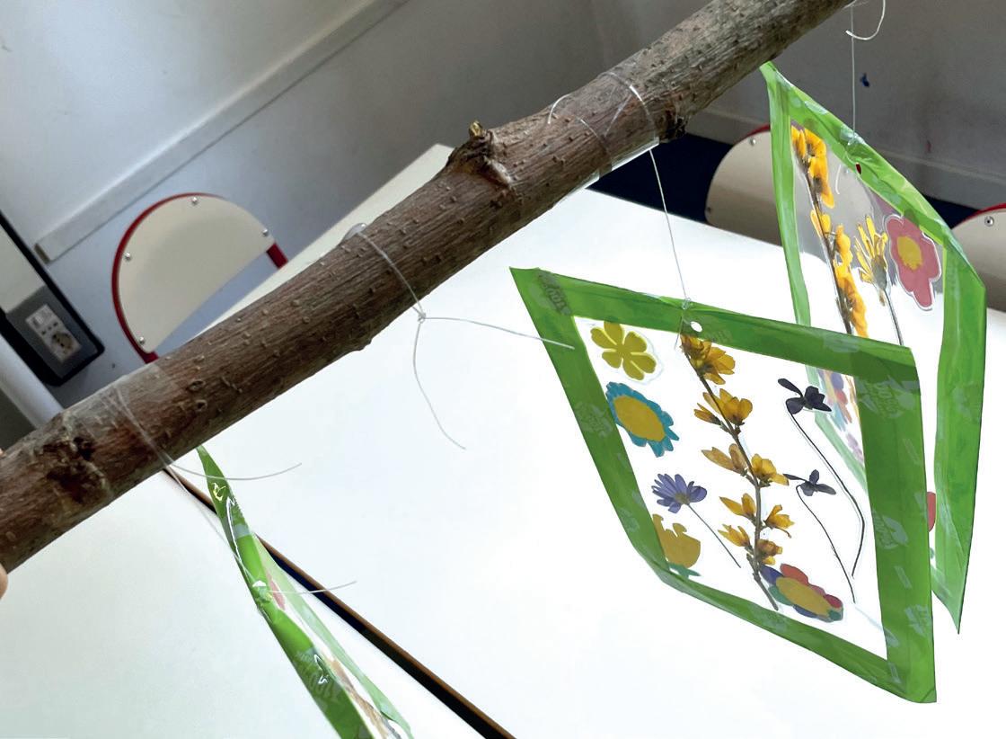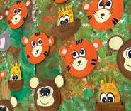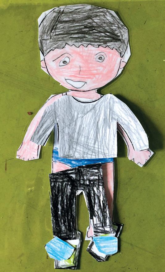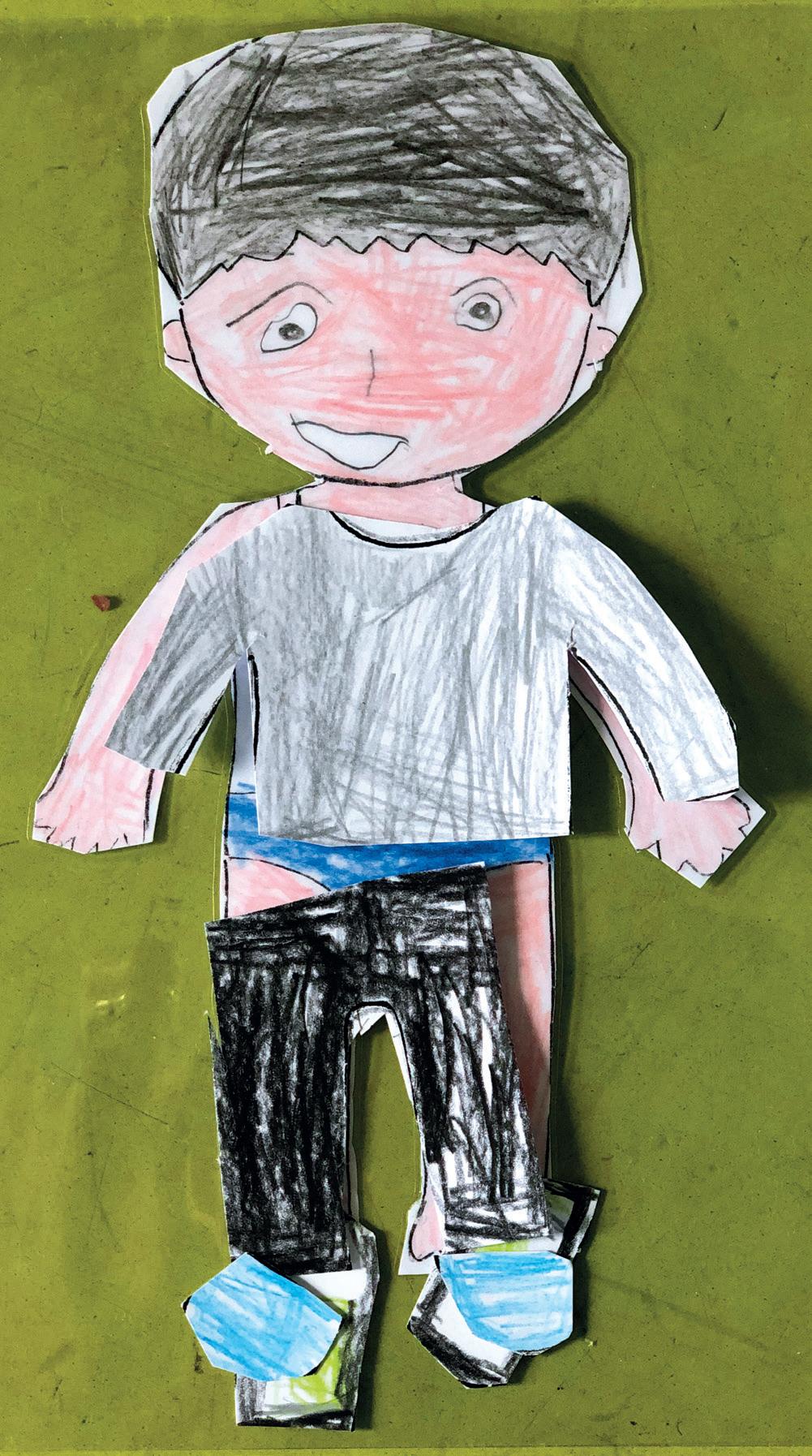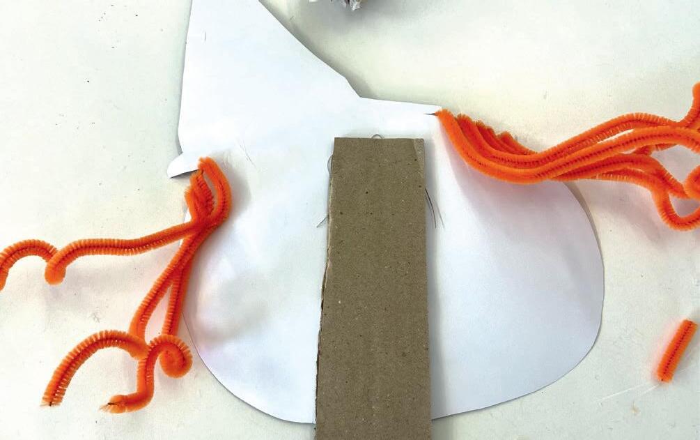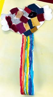 3 Utilizziamo i personaggi realizzati con i piatti per il cartellone della foresta fatto durante l’accoglienza (vedi p. 64), dietro a ognuno fissiamo un filo di lana gialla con la pinzatrice, quindi pinziamoli in alto nella busta per completare la decorazione e consegnare a ciascuno i propri lavori.