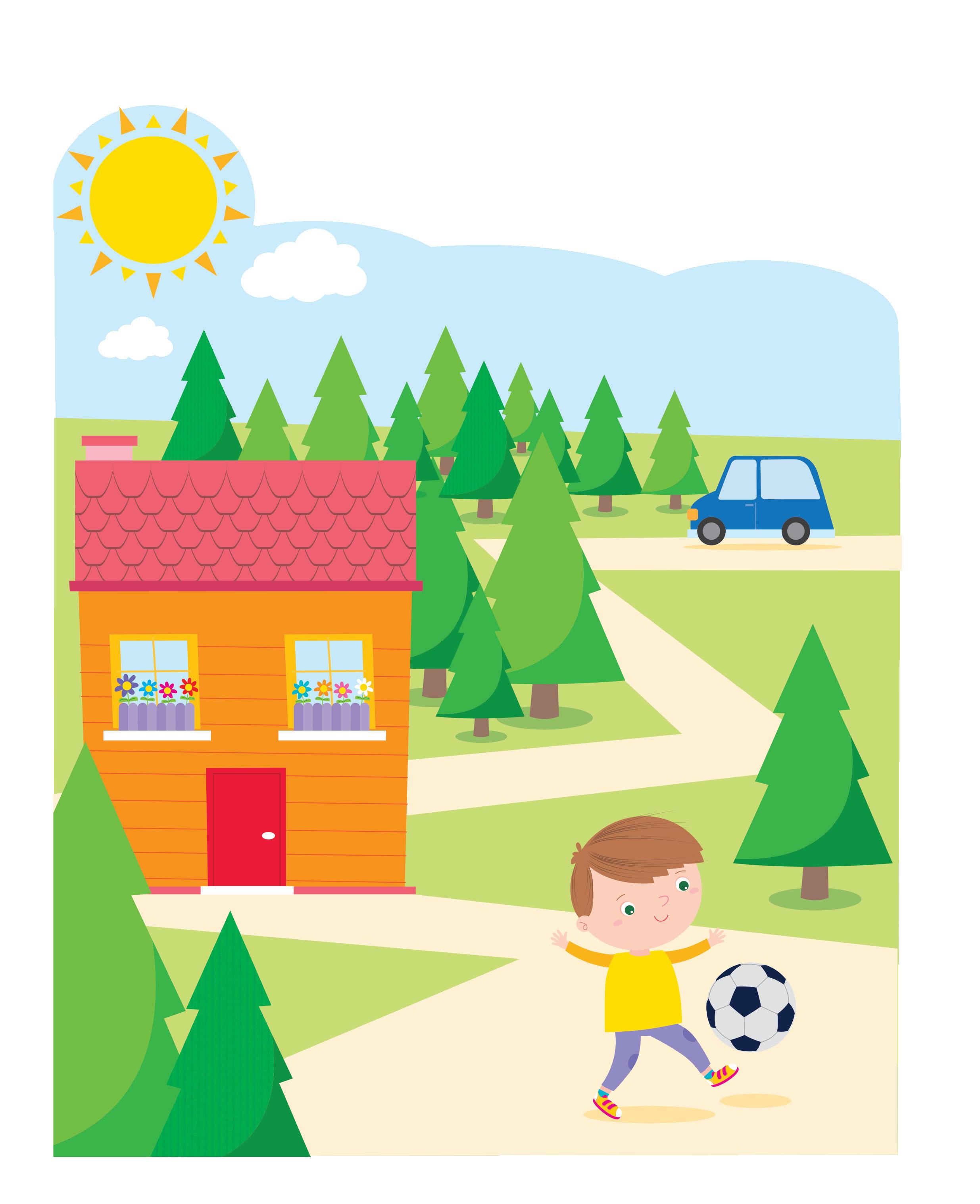 In un bosco c’era una casa arancione. La porta era in basso, le due finestre avevano sul davanzale fiori colorati. Dalla stradina si vedeva arrivare un’automobile blu. Il sole era alto nel cielo. Marco decise di andare fuori a giocare con la palla.