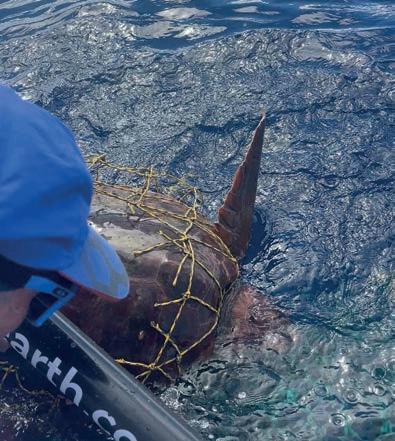 A RAF rower’s bid to cross the Atlantic was halted as her team changed course to rescue a turtle trapped in plastic netting.