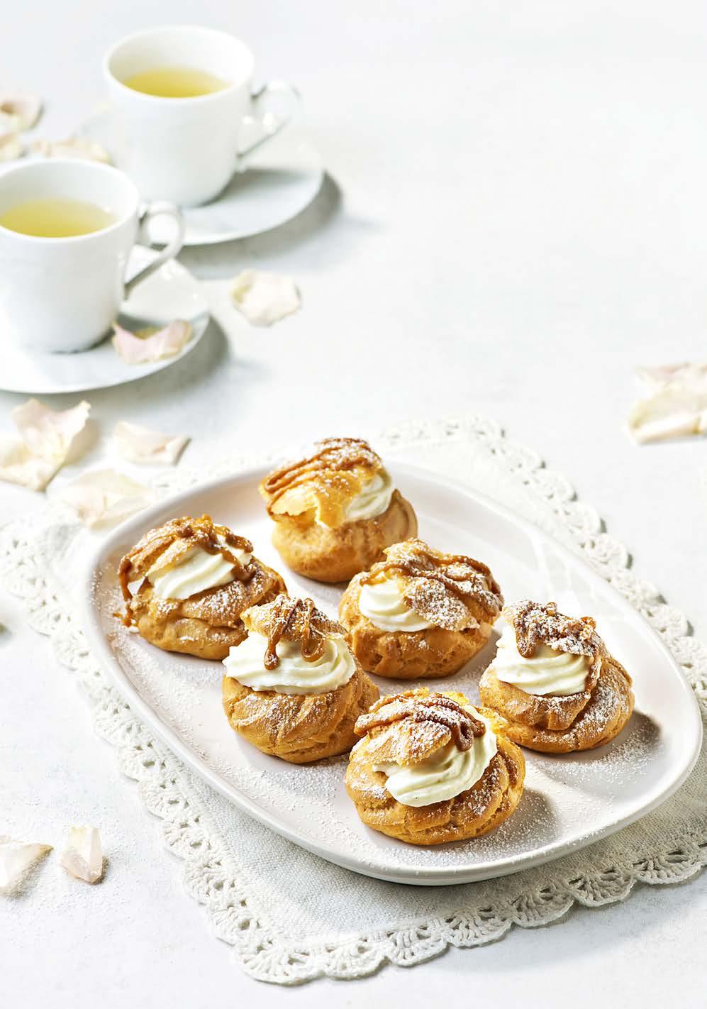 Vahusta koor suhkruga ja sega kohupiima hulka. Maitsesta vanillisuhkruga. Lõika taskutel kaas pealt. Pritsi pritskotist või tõsta lusikaga taskutesse pooles ulatuses kohupiimatäidist. Tõsta peale 1 tl karamellist kondenspiima ja pritsi peale ülejäänud kohupiimatäidis. Pane kaas peale tagasi.