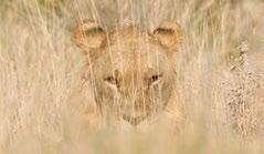 Auf dem Bild ist der Kopf eines Löwen zu sehen, der durch hohes, trockenes Gras verdeckt ist. Die Augen des Löwen sind fokussiert und direkt auf den Betrachter gerichtet, was ein Gefühl von Aufmerksamkeit und vielleicht auch von Bedrohung vermittelt. Die Tarnung im Gras zeigt, wie gut Löwen sich in ihrer natürlichen Umgebung verstecken können, was für ihre Jagdtechnik entscheidend ist.