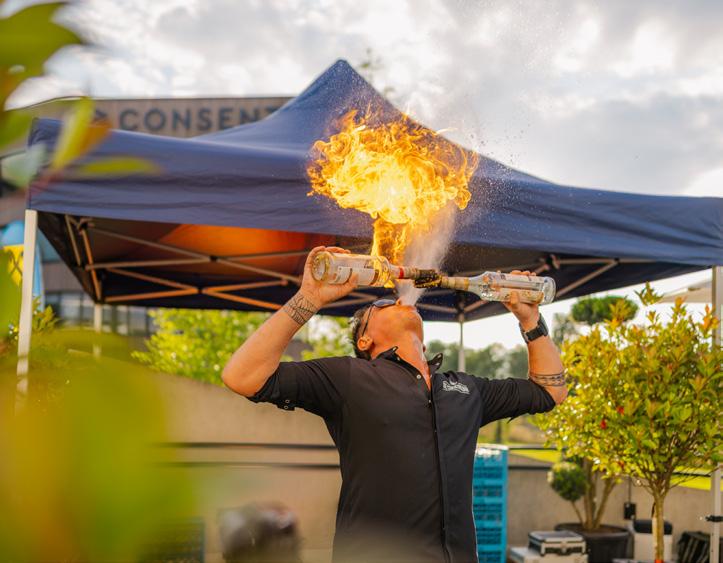Stefan Haneder unterhielt uns mit einer beeindruckenden Barkeeping Show und eine mitreißende Feuershow rundete den Abend ab. Kulinarisch wurde der Abend durch einen Foodtruck mit außergewöhnlichen Speisen bereichert, gefolgt von einer Dessertbar, die eine Vielzahl an süßen Köstlichkeiten bot.