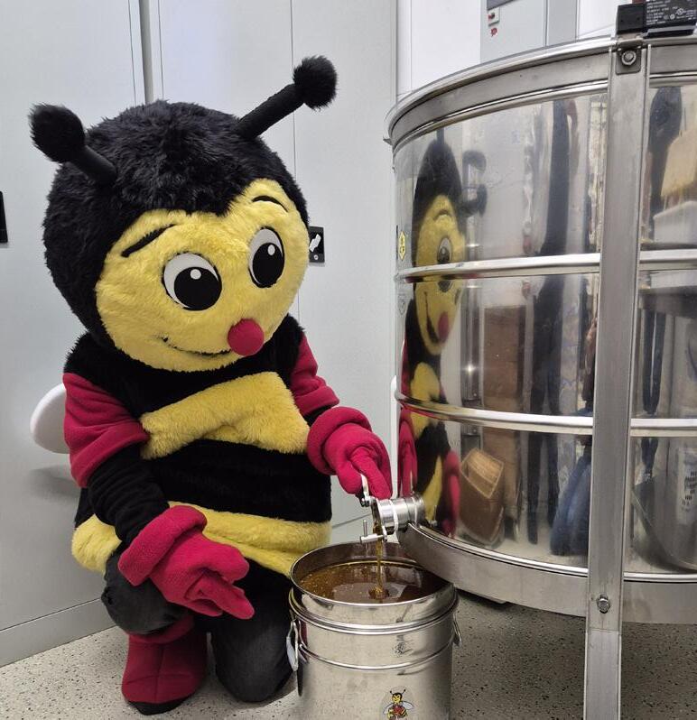 Auch Sumsi war mit dabei, als der frische Honig geschleudert wurde. Sie hat den Imkern fleißig über die Schultern geschaut und dafür gesorgt, dass kein Tropfen verloren geht.