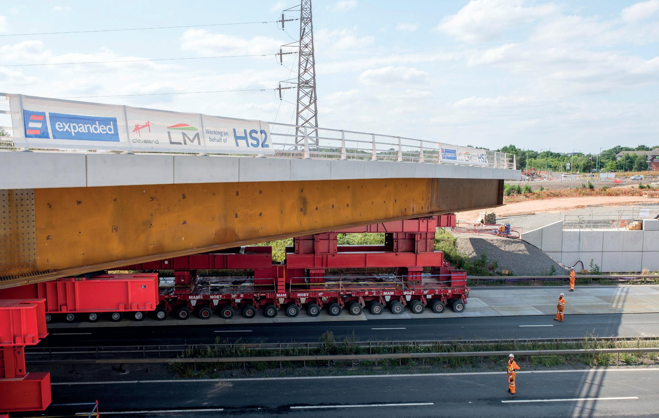 Made up of 1,130 tonnes of steel plate girders and 1,610 tonnes of precast and in-situ concrete, the structure was ‘driven’ up the closed motorway and into position in just two days on top of two selfpropelled modular transporters. This bridge will be a road bridge, part of the new road layout being created around HS2’s new Interchange station.