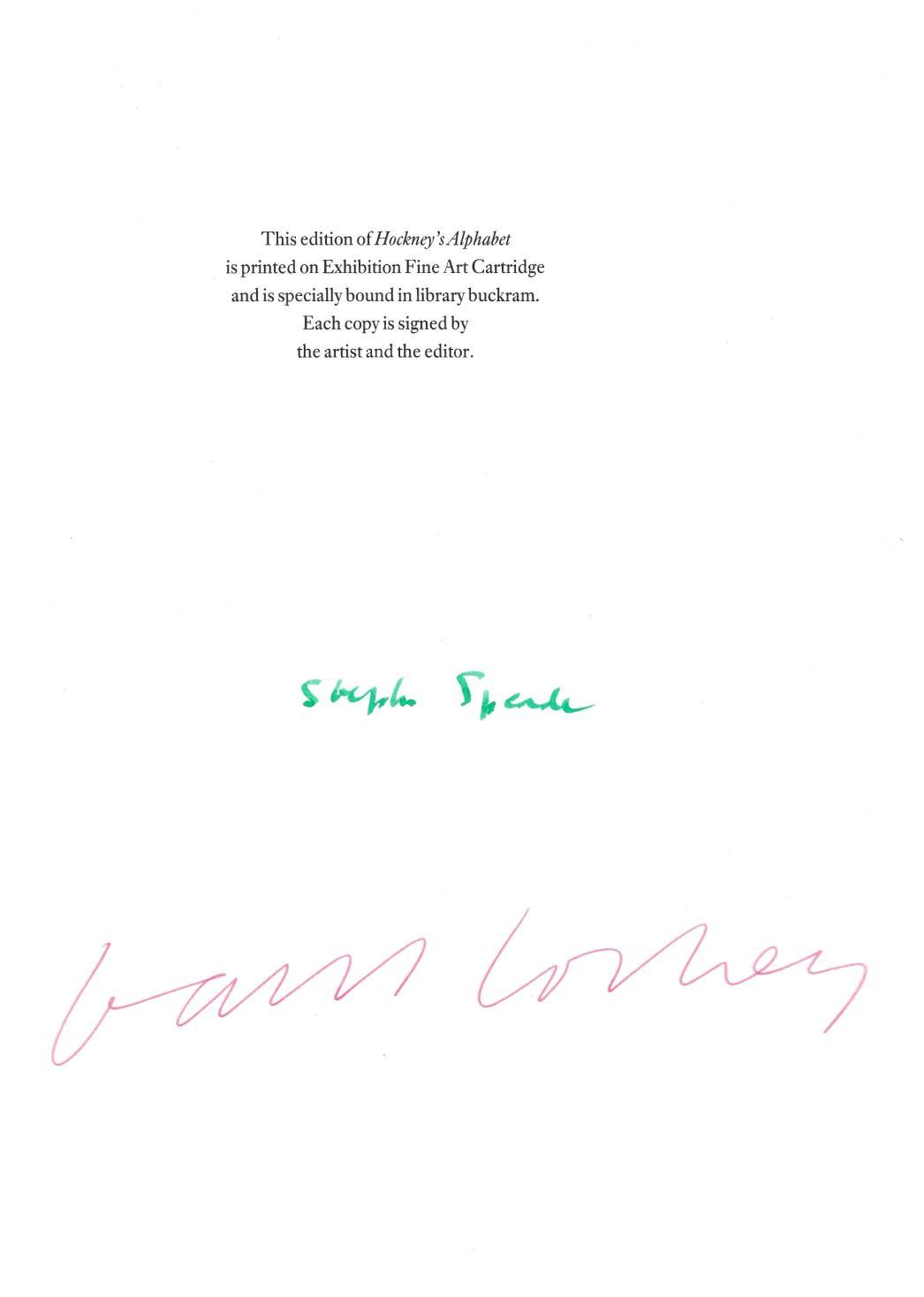 In 1991, on behalf of the Aids Crisis Trust in London, Sir Stephen Spender invited a number of distinguished writers in Britain and America to contribute original texts, prose or poetry, to accompany an alphabet of initial letters specially drawn for the Trust by David Hockney