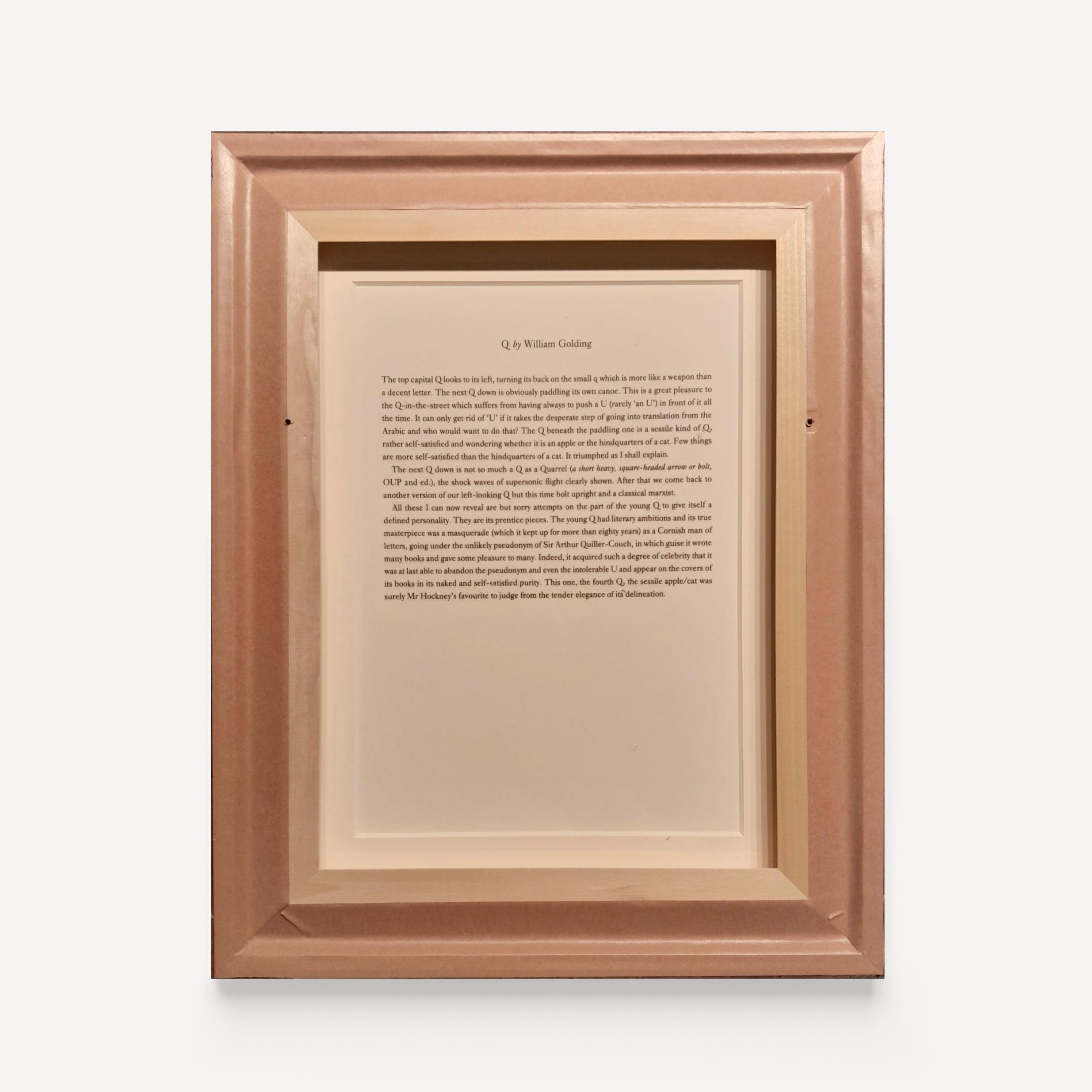 Comprising 30 framed artworks in total, including 27 Alphabet letters (there are 2 illustrations of the letter ‘Q’) and their accompanying texts. There are 3 additional pages of framed text, including the justification page which is signed by both David Hockney and Stephen Spender.