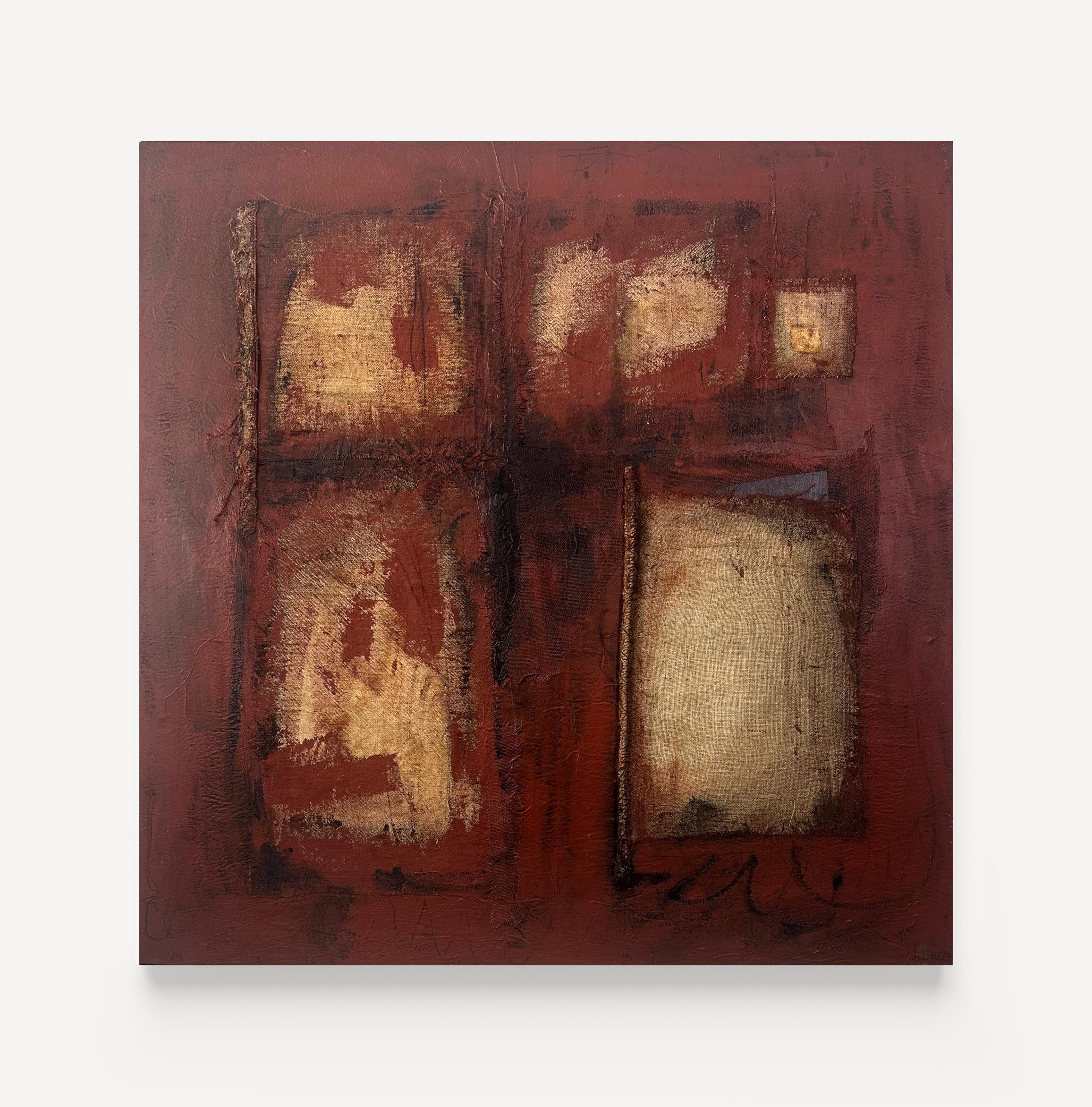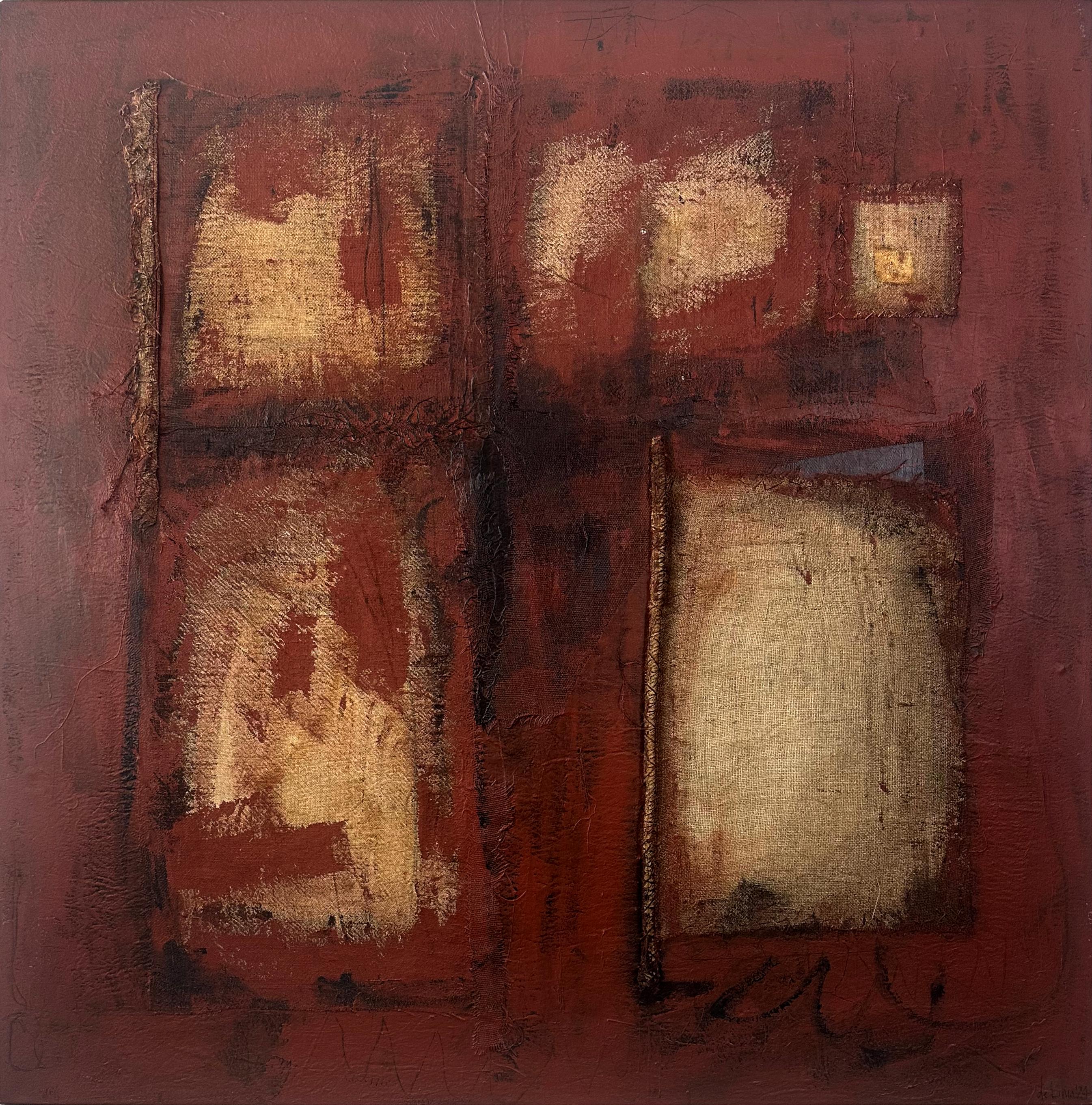 Acrylic, burlap with stitching on canvas