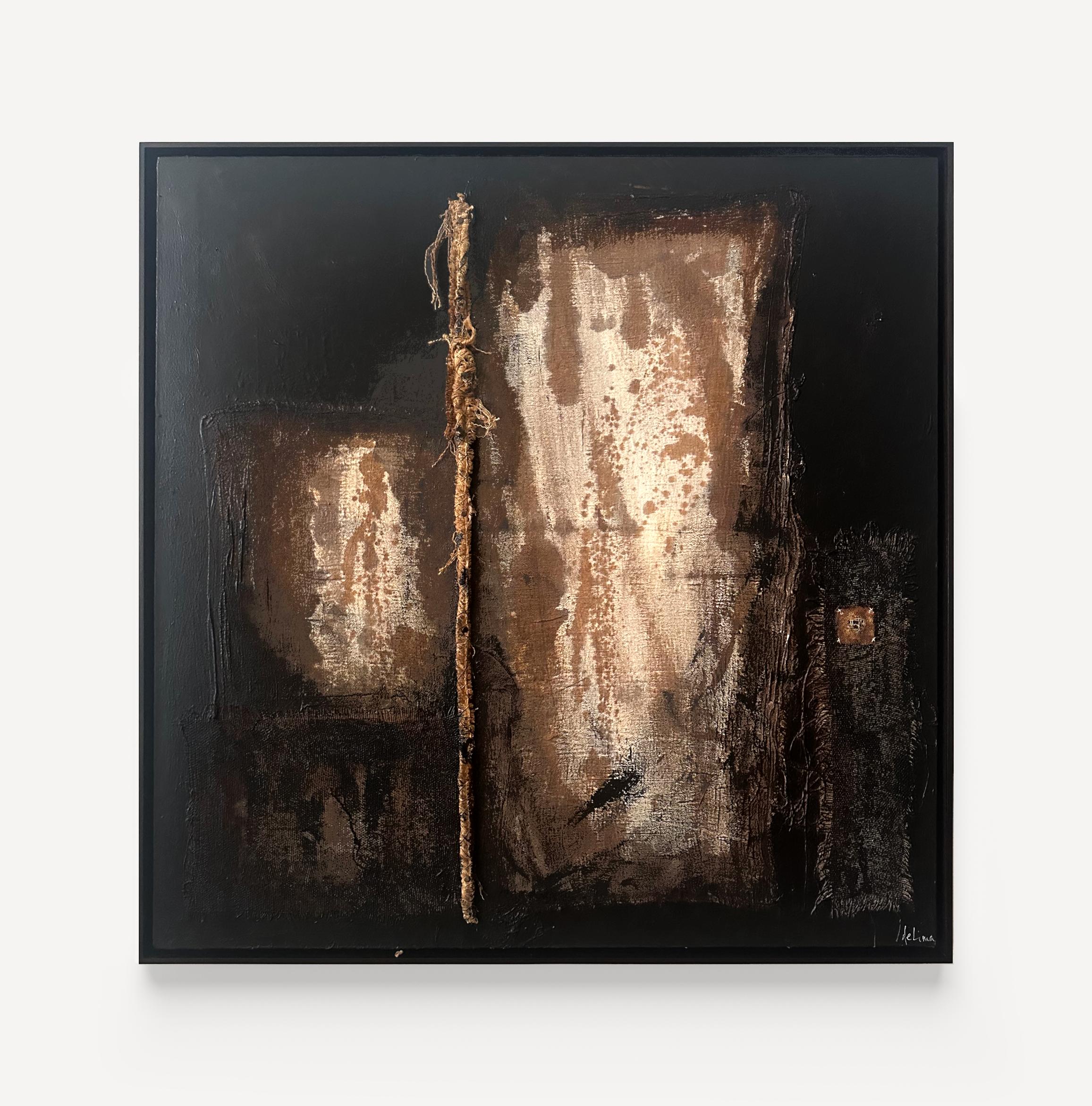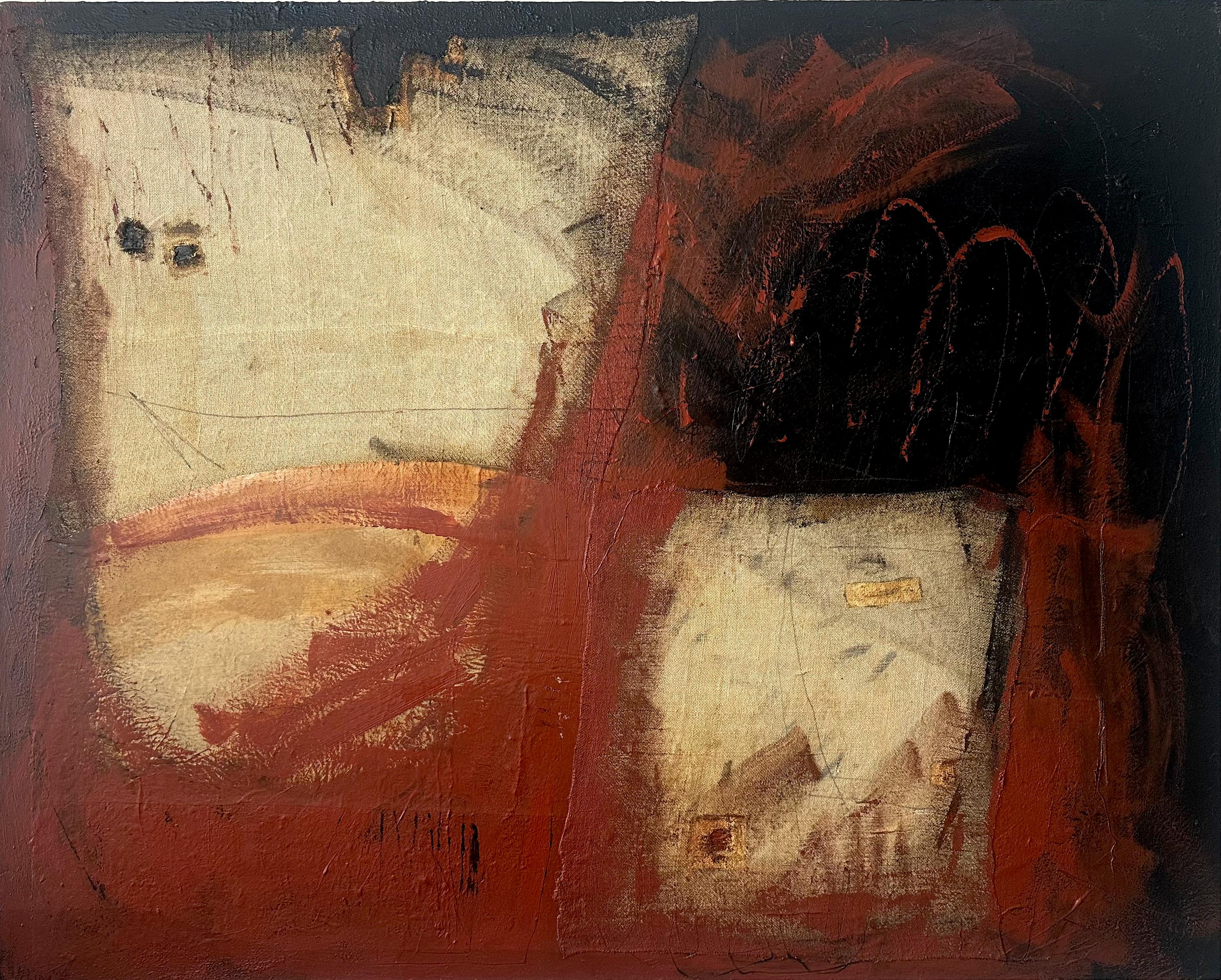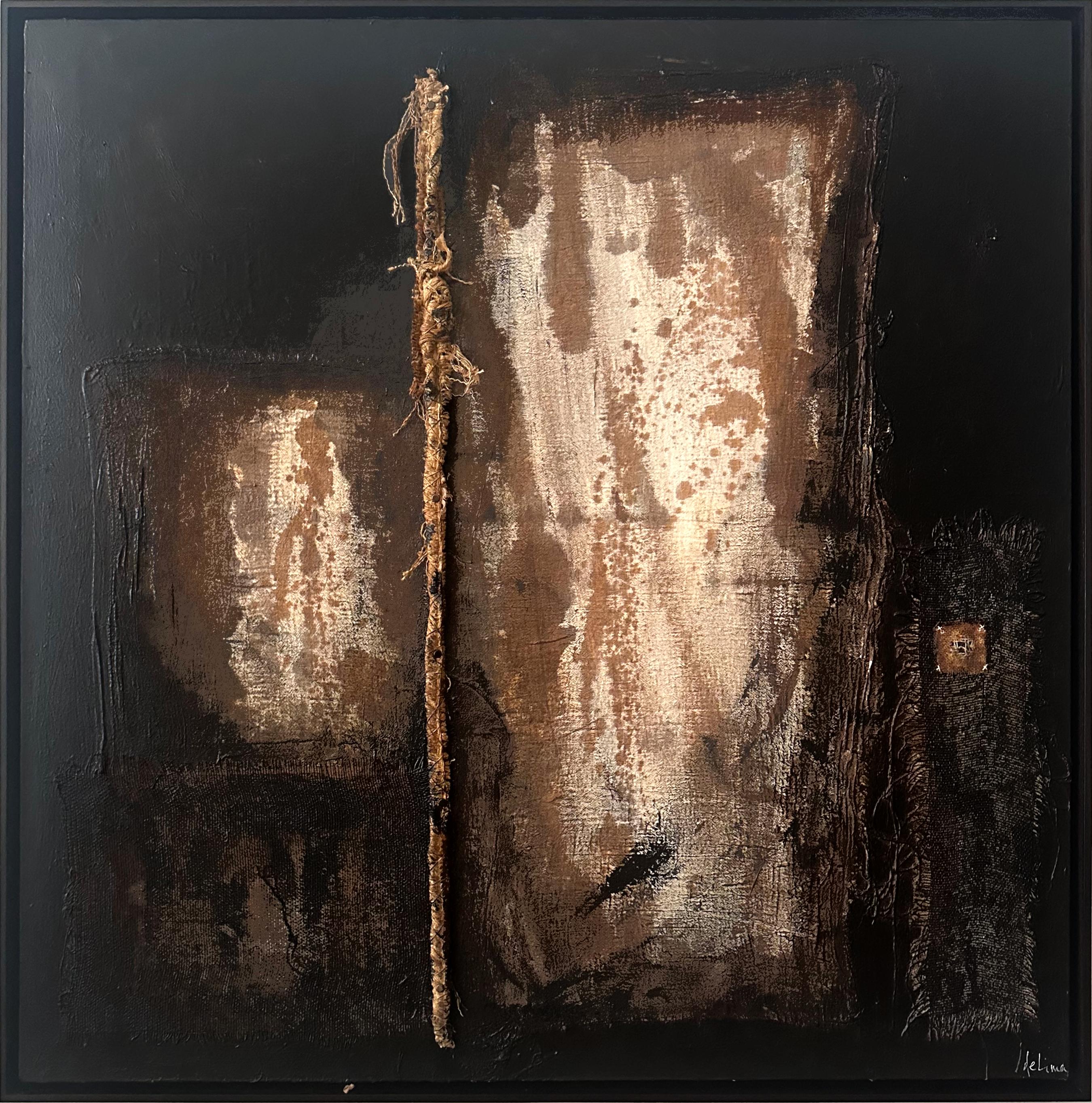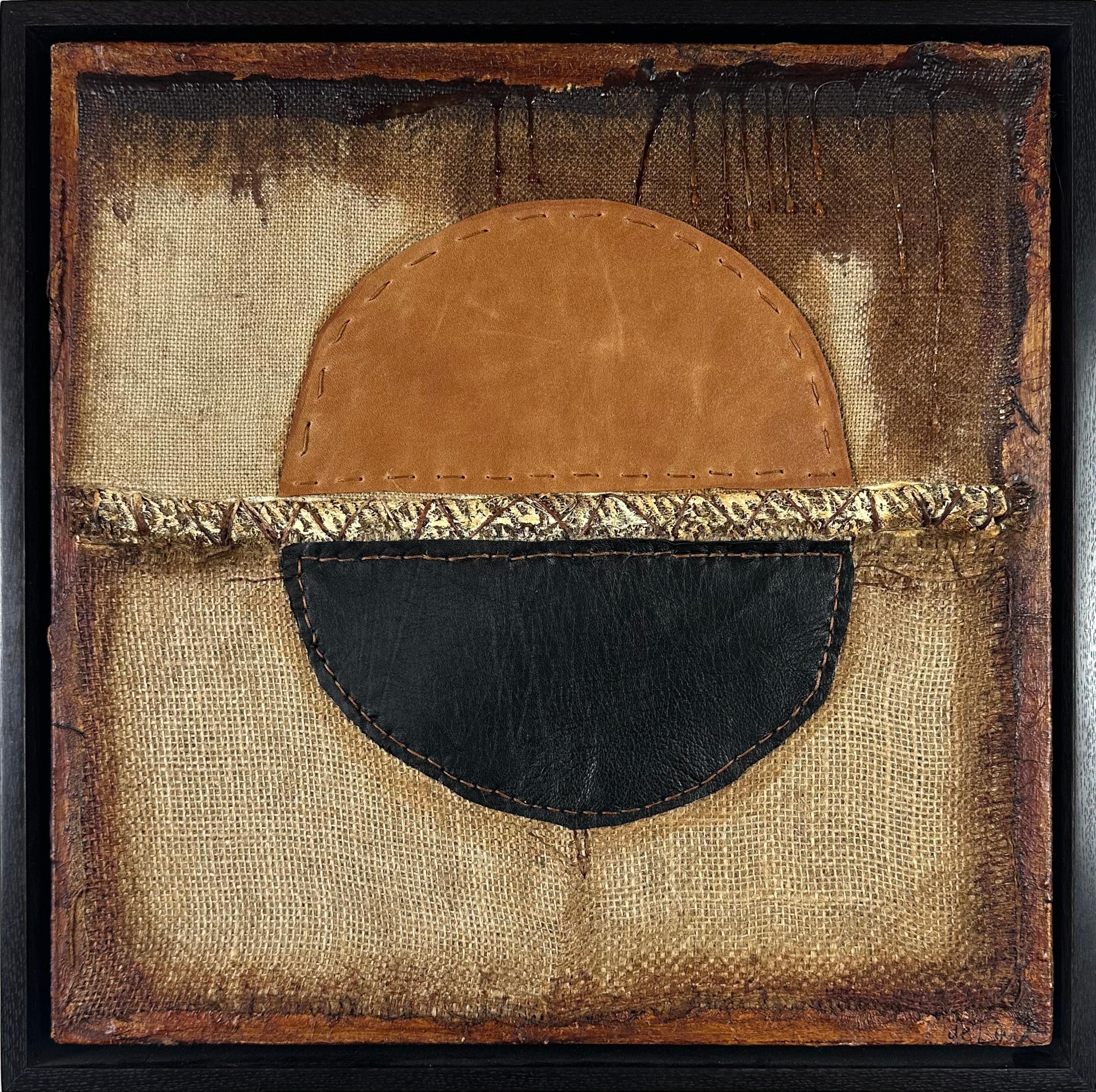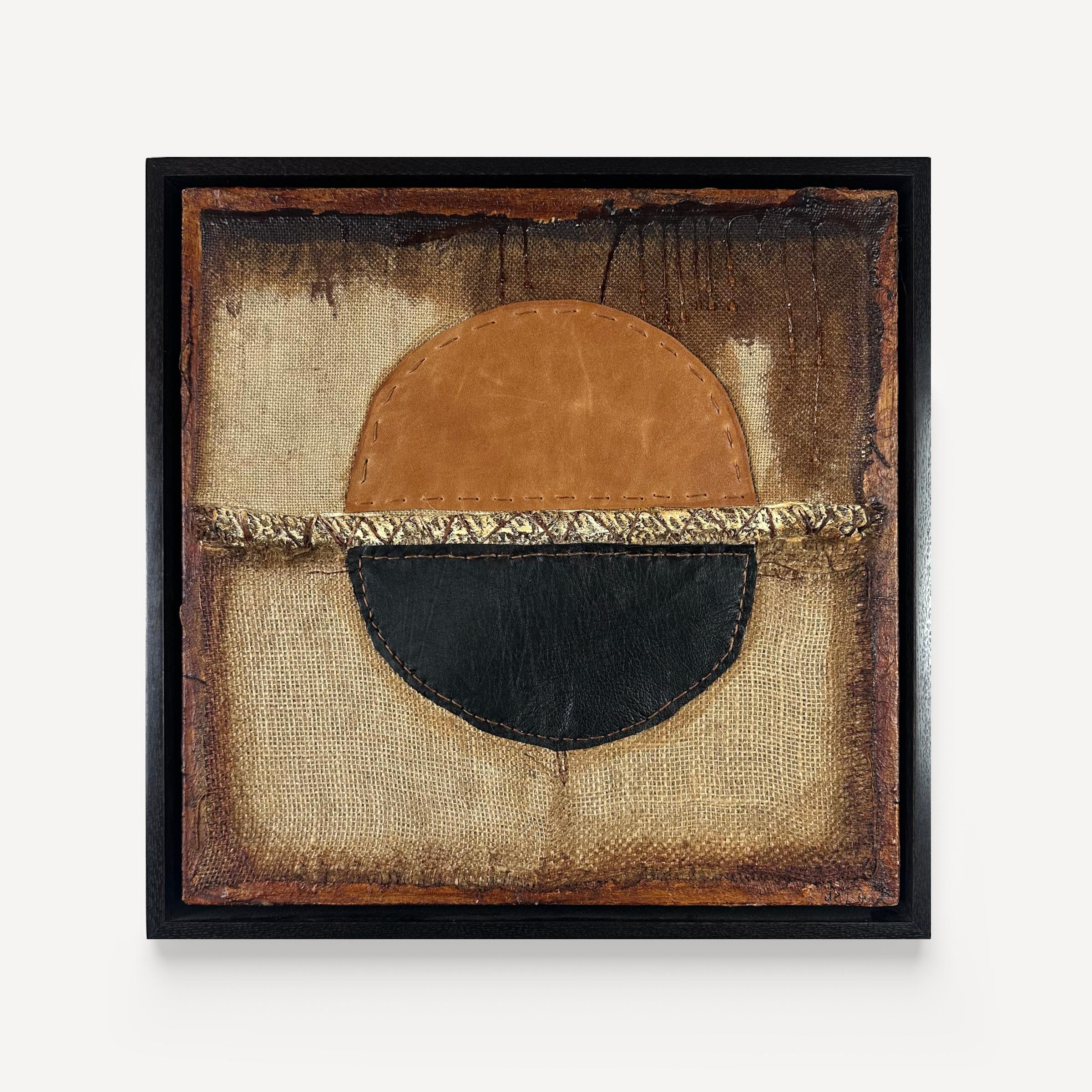 Acrylic, wax, burlap & leather on canvas