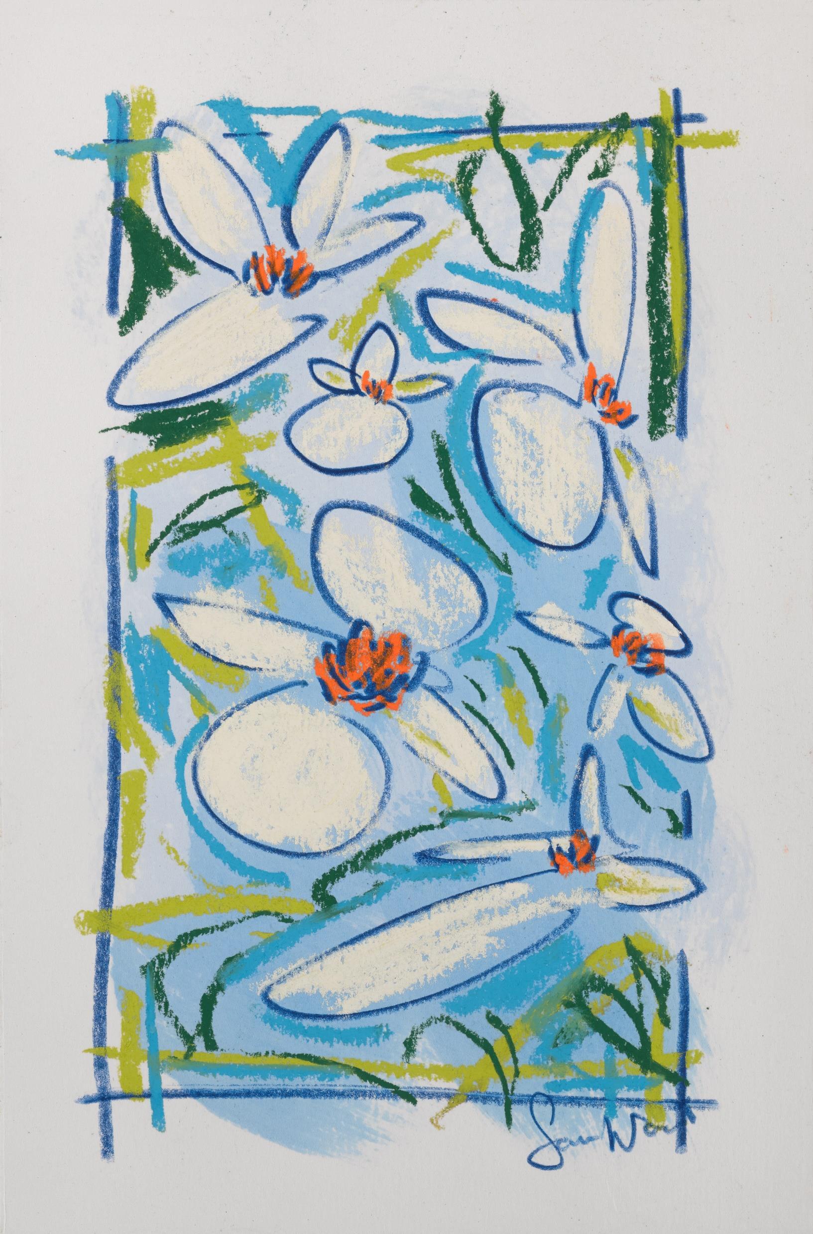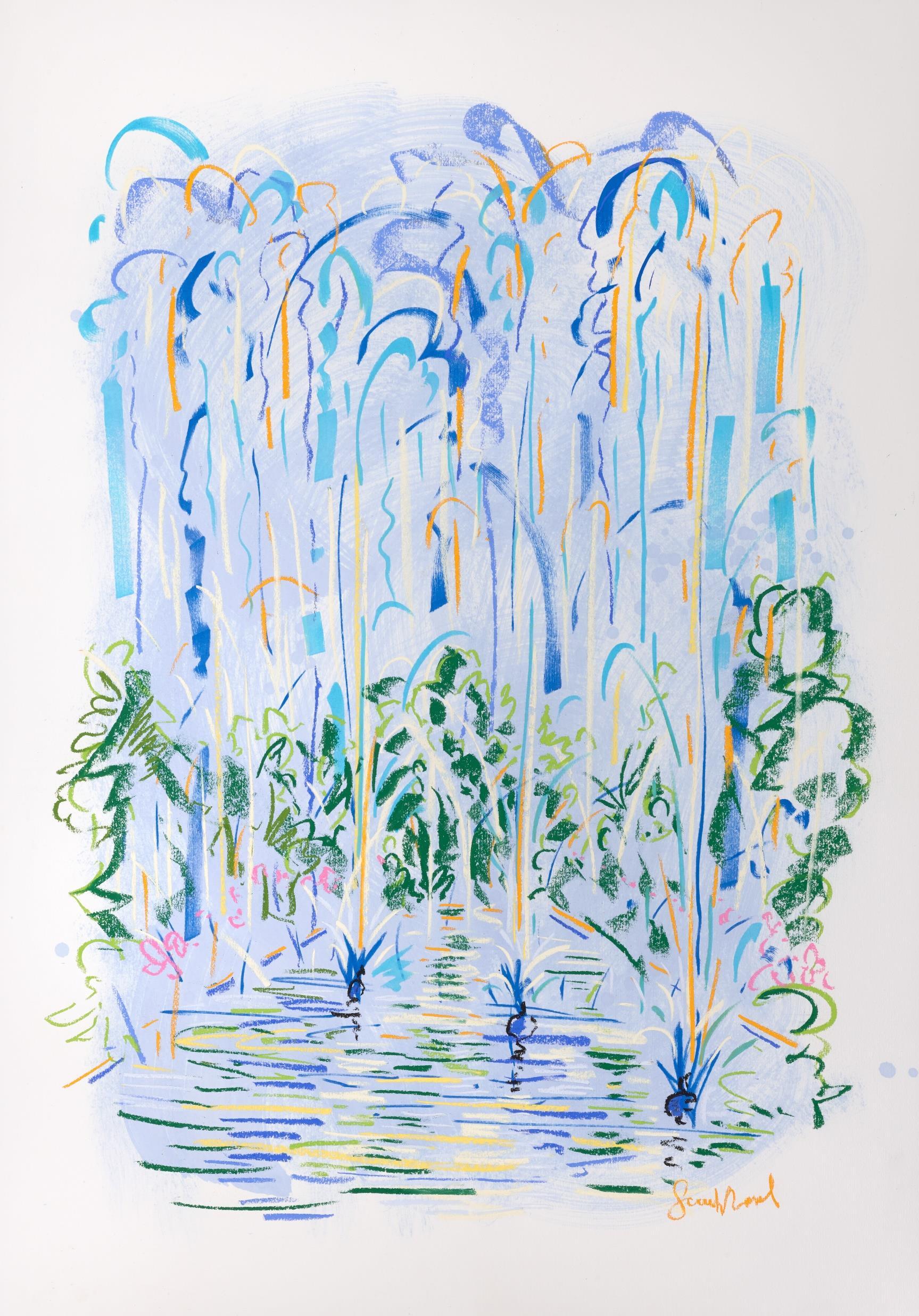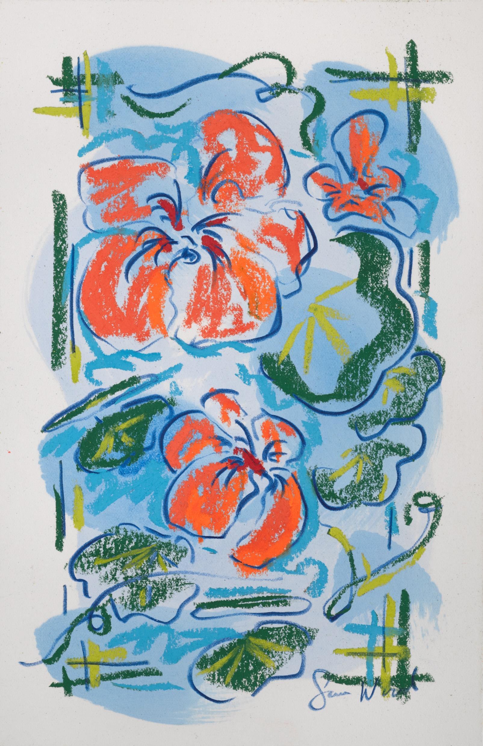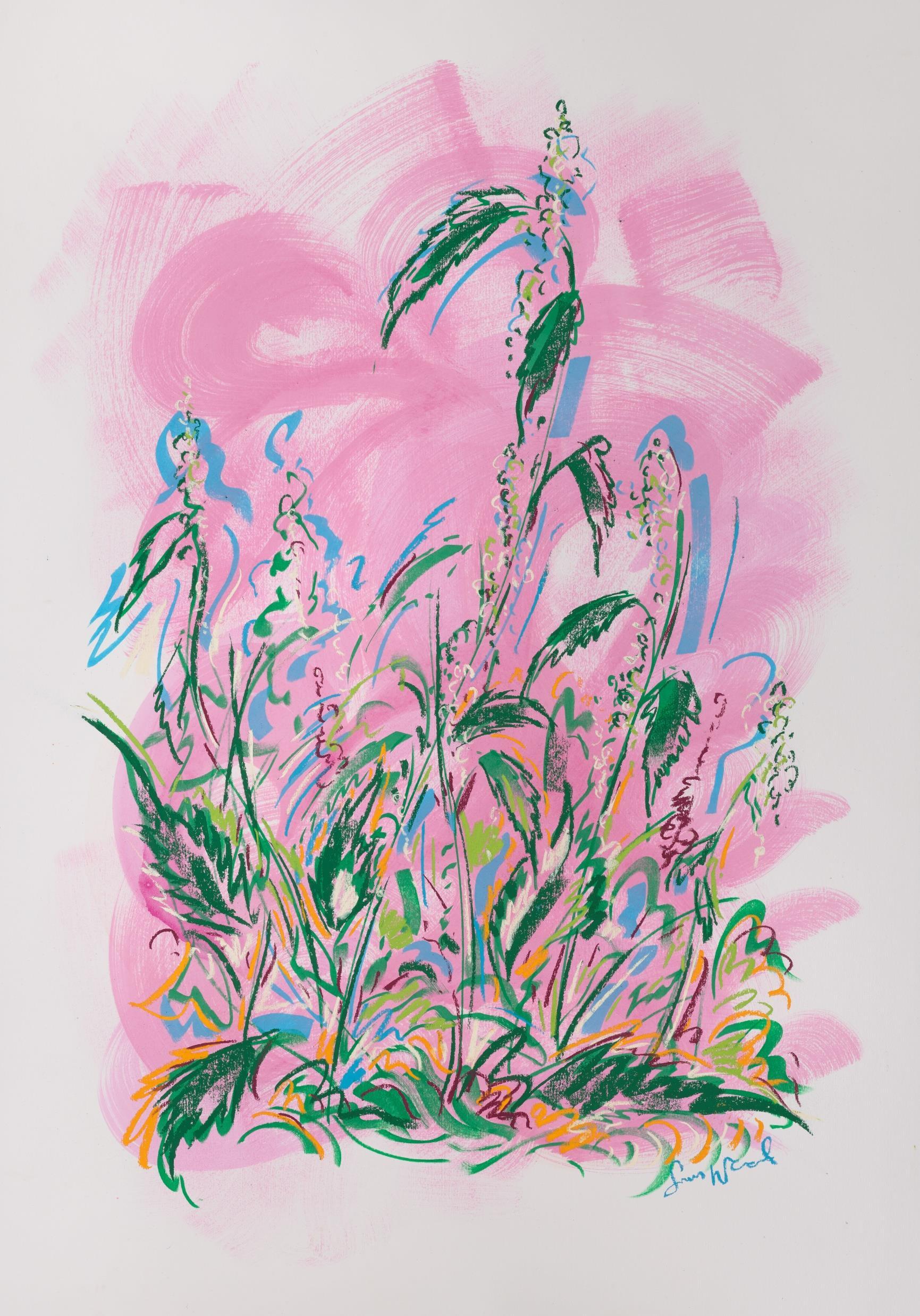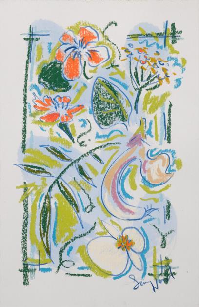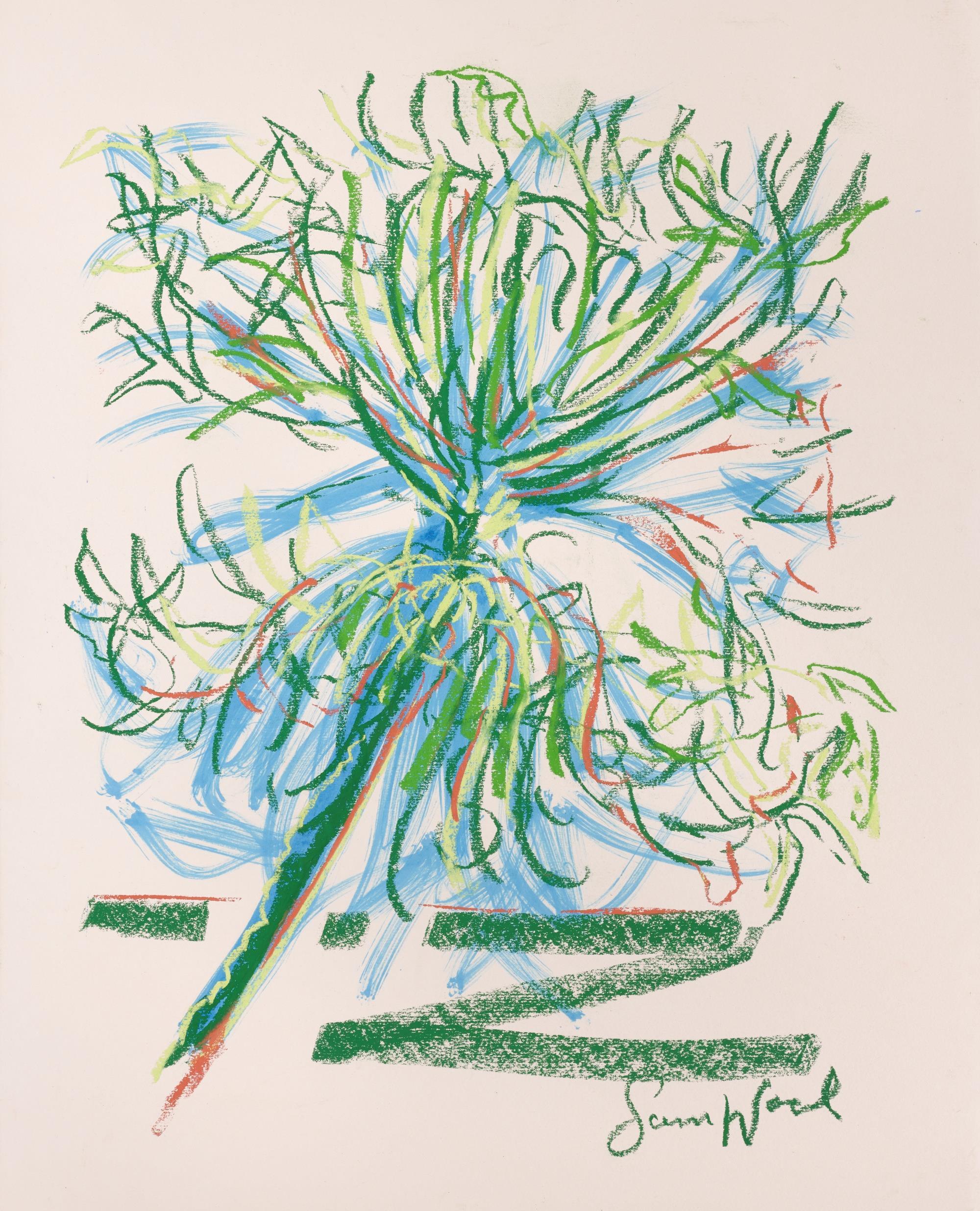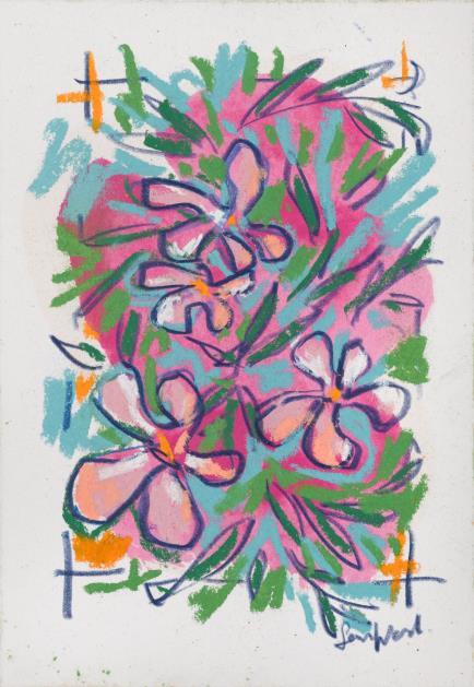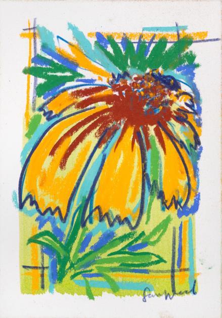 Central to his work is the importance of drawing, in both dry and wet media, where broad brushstrokes of diluted oil paint underpin lyrical linework in soft pastel The immediacy of Wood’s mark making demonstrates a highly responsive eye that captures any given subject with an economy of means. Rendered in joyful, saturated colours the resultant works radiate effects of light that ripple across the paper, creating a sense of restless energy as lively as the natural subjects they depict.