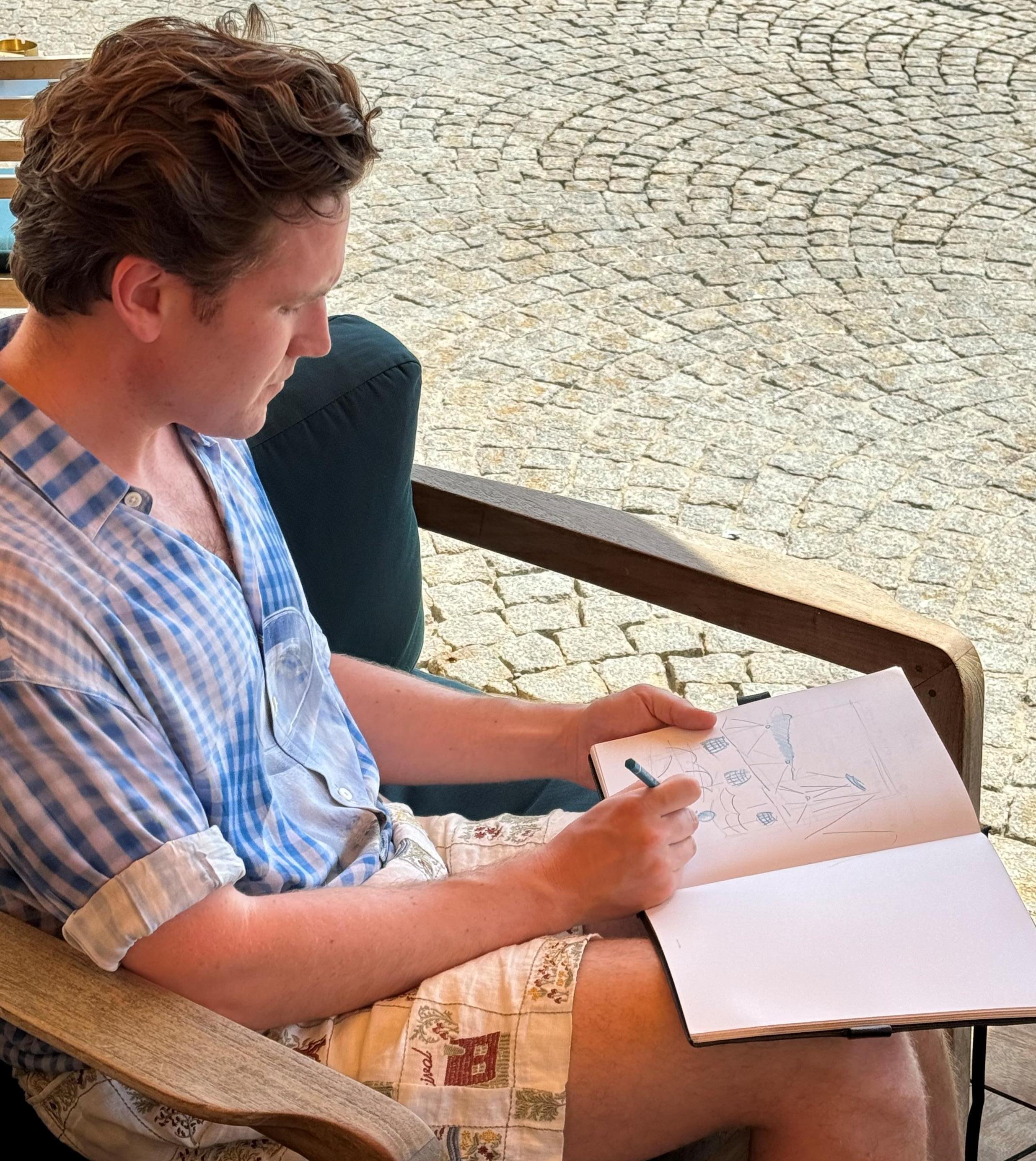 Wood had his first glimpses of the Cote D’Azur through a commission to create two artworks for Mauro Collagreco at Raffles London, which opened at the OWO in 2023. The artworks feature a hilltop view of the distinctive sweeping bay of Menton, taking in tumbling terraces of lush green vegetation and the azure blue sea and sky beyond.
