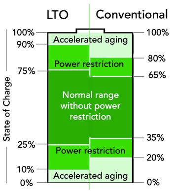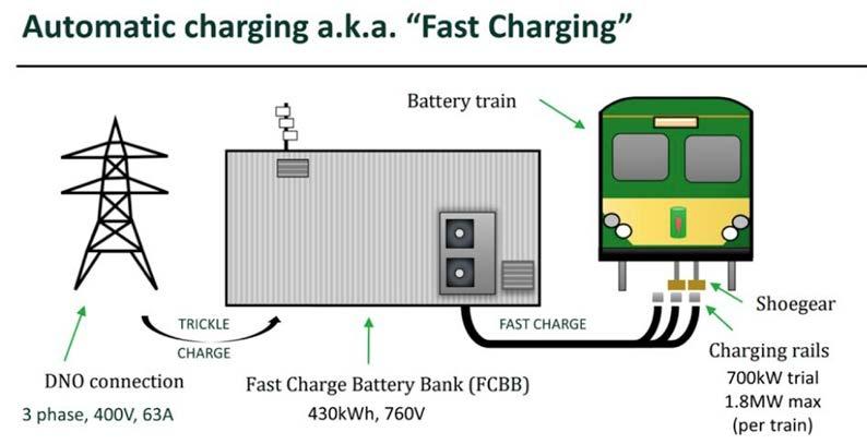 450mm wheel size, 1-metre wheel-base, and 7.6 metres between bogie centres. The overall width is 2.637 metres. The tare mass is 11 tonnes, about 1 tonne per metre, thanks to the use of composites in the construction. A total of 50kWh of electrical energy is stored in two safe and long-life 650V Lithium Titanite batteries. These weigh a total of about 900kg, including the battery control system. These are fast charge batteries, able to deliver 160A to four axial flux machines with a nominal power of 64kW. It has an 80kWh Lithium Titanium Oxide battery, which is the same type as those used on the Class 93 locomotives.