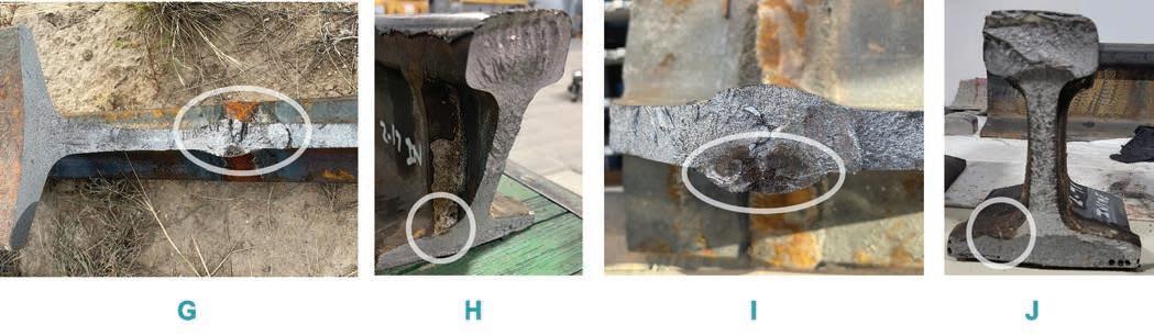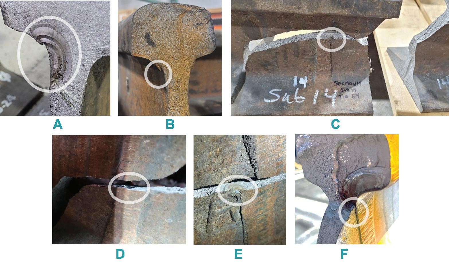 24 EFB weld failures that occurred at FAST in 2024. The ovals indicate the fracture origins identified during examination. Most failures were related to the sharp change in profile due to insufficient post-weld grinding at the head/ web fillet or on the web/base fillet and originated with the fracture at the stress risers. Failures A and B showed the fused metal forming a lip that was not removed by shearing and grinding after the EFB weld was performed. The weld failures in D and E were linked to branding marks that were not removed by pre-weld grinding on the rail and therefore could have acted as stress risers. The C and F weld failures occurred because of the sharp profile change along the web, which also should have been removed by grinding after welding was completed. Although no obvious metallurgical reasons were found for these failures, some of the failures were dissected and observed using metallurgical analysis. The fracture initiation in weld fracture F revealed a stress riser with considerable deformation caused by alternate fatigue bending cycles from train operations due to the nonremoval of the metal lip along the edge of the fusion zone.1 Insufficient post-weld shearing and/or grinding to remove the stress risers caused these failures.