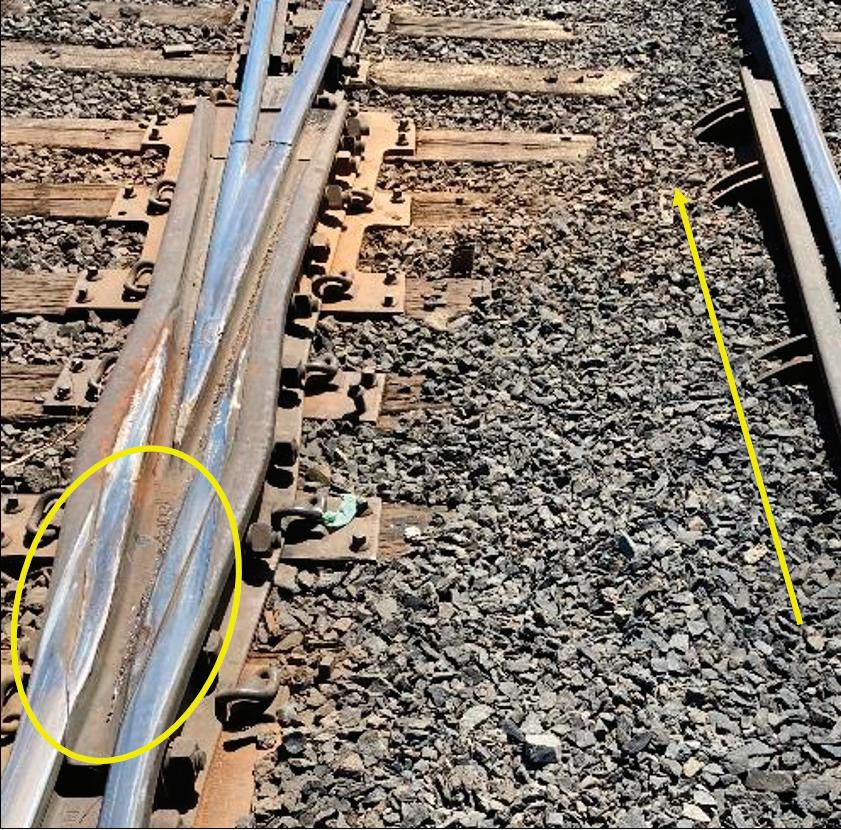 Seven thermite weld breaks were observed during 2024 FAST operations, three of which occurred before 25 million gross tons (MGT) were accumulated. All seven thermite welds were analyzed due to concerns about the low tonnage accumulation in some of the welds prior to failure. Figure 3 shows photos of four of the weld failures with white ovals indicating the fracture initiation locations.
