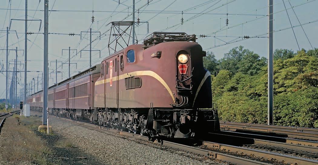 Pennsy Tuscan Red GG1 4907 and train at New Brunswick, N.J., headed to New York City on September 19, 1962. The non-streamlined equipment suggests it’s not a name train. The 4907 was the only Tuscan Red GG1 the photographer saw during his few days on the Pennsy, 9.16.1962 to 9.21.1962. All the others were Brunswick Green. Photography by Tom Gildersleeve, collection of Center for Railroad Photography & Art.