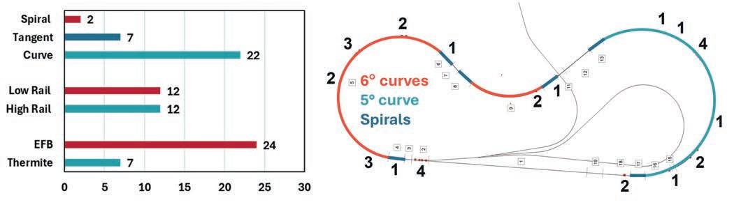 consisting of three locomotives and up to 114 loaded coal gondola cars loaded to 286,000 or 315,000 pounds. In the first year of operations on the new track, 31 weld breaks have occurred. A summary of the most commonly observed root causes for the different thermite weld failures, and EFB weld failures can be found in a previously published Technology Digest.1 Figure 1 (left) shows the distribution of the weld breaks/failures based on three different criteria: track curvature, side of rail in curves and spiral, and type of weld. Twenty-two of the 31 breaks (71%) were found in curves; seven were found in tangent; and two were found in a spiral. Of the 24 weld failures occurring on curves or in spirals, 12 were on the high rail, and 12 were on the low rail. Regarding tie type, 16 of the 31 were found on rails with concrete ties and the remaining 15 failures were found on rails with wood ties. Of the 15 failures on wood ties, 10 were on rails with cut spikes, and five were on rails with elastic fasteners. There were 24 EFB weld failures, three occurring on tangents and two found on a spiral. Four of the seven thermite weld failures were on tangents and three were on curves. Figure 1 (right) reflects the location of weld breaks in the FAST loop with the spirals and five- and six-degree curves shown in colors.