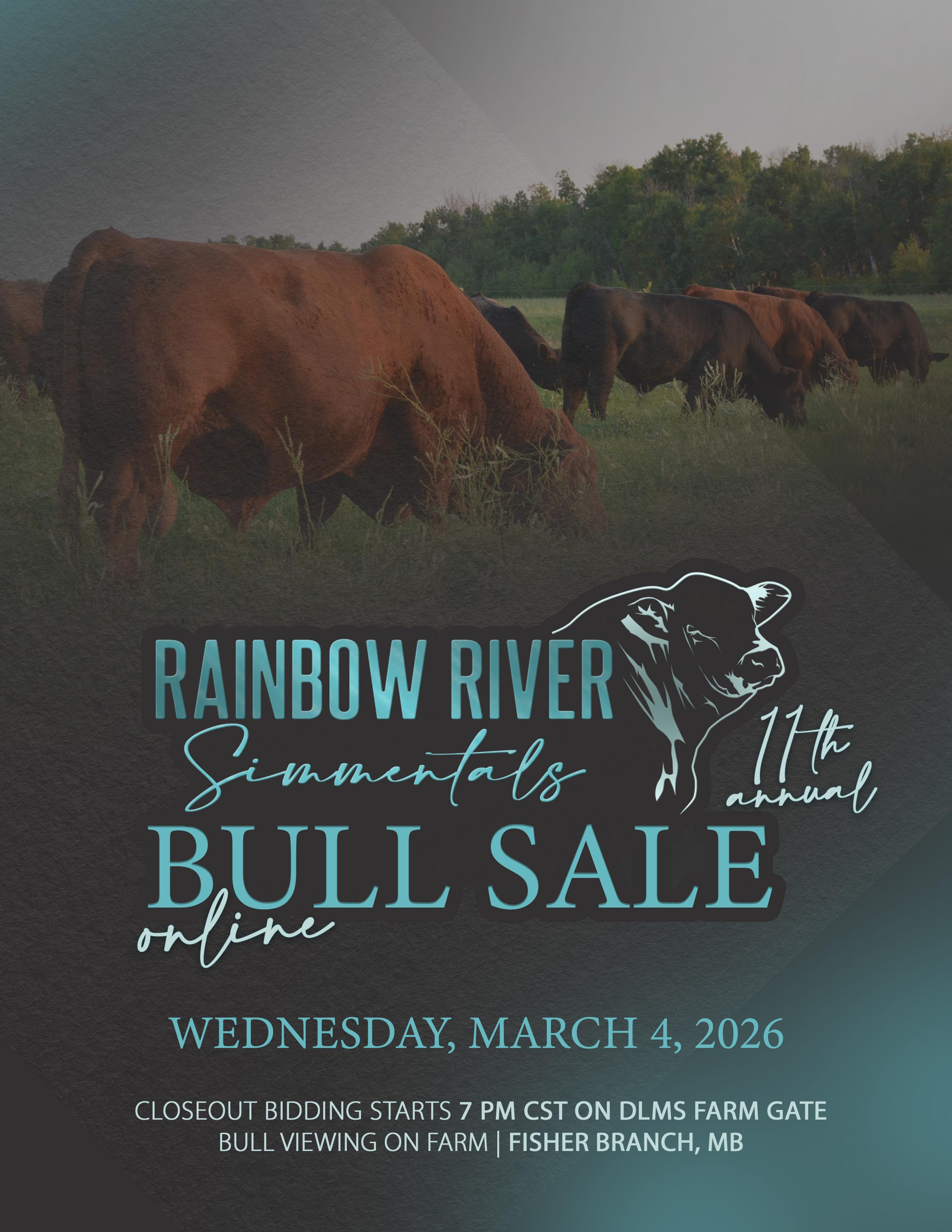 Option B: Free delivery to central locations in Manitoba and most of Saskatchewan. We normally deliver right to your yard. Delivery will begin immediately after the sale at the seller’s convenience. If you are unable to receive your bull when we are delivering to your area, the bull must be picked up from Rainbow River Simmentals at the buyer’s expense.