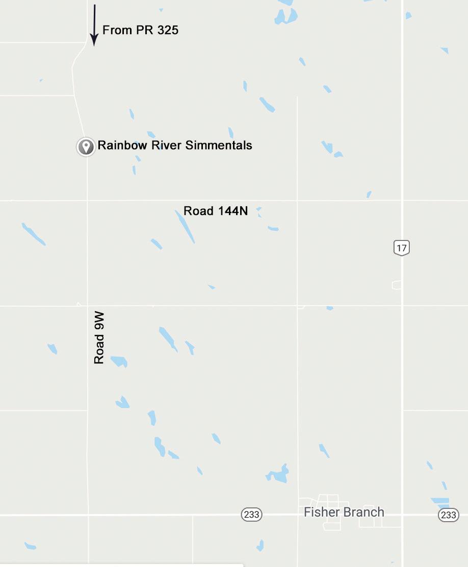 From the corner of Fisher Branch at Highway 17: Drive 3 miles north on highway 17, turn west onto Rd 144N and go 3 miles until you come to your first stop sign. Turn north onto Rd 9W and we are the first farm on the west side, up on the hill.