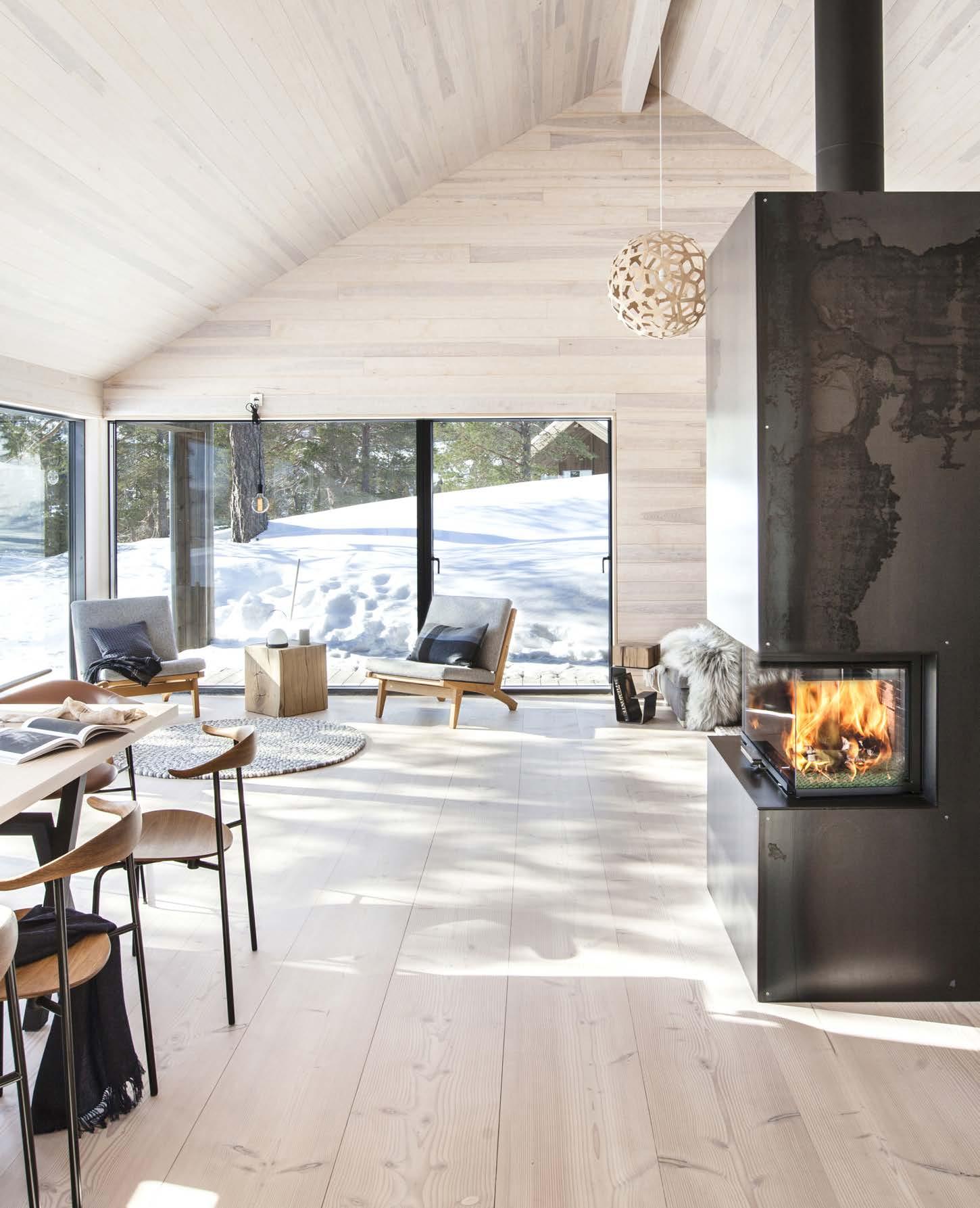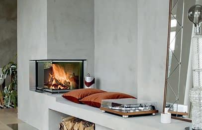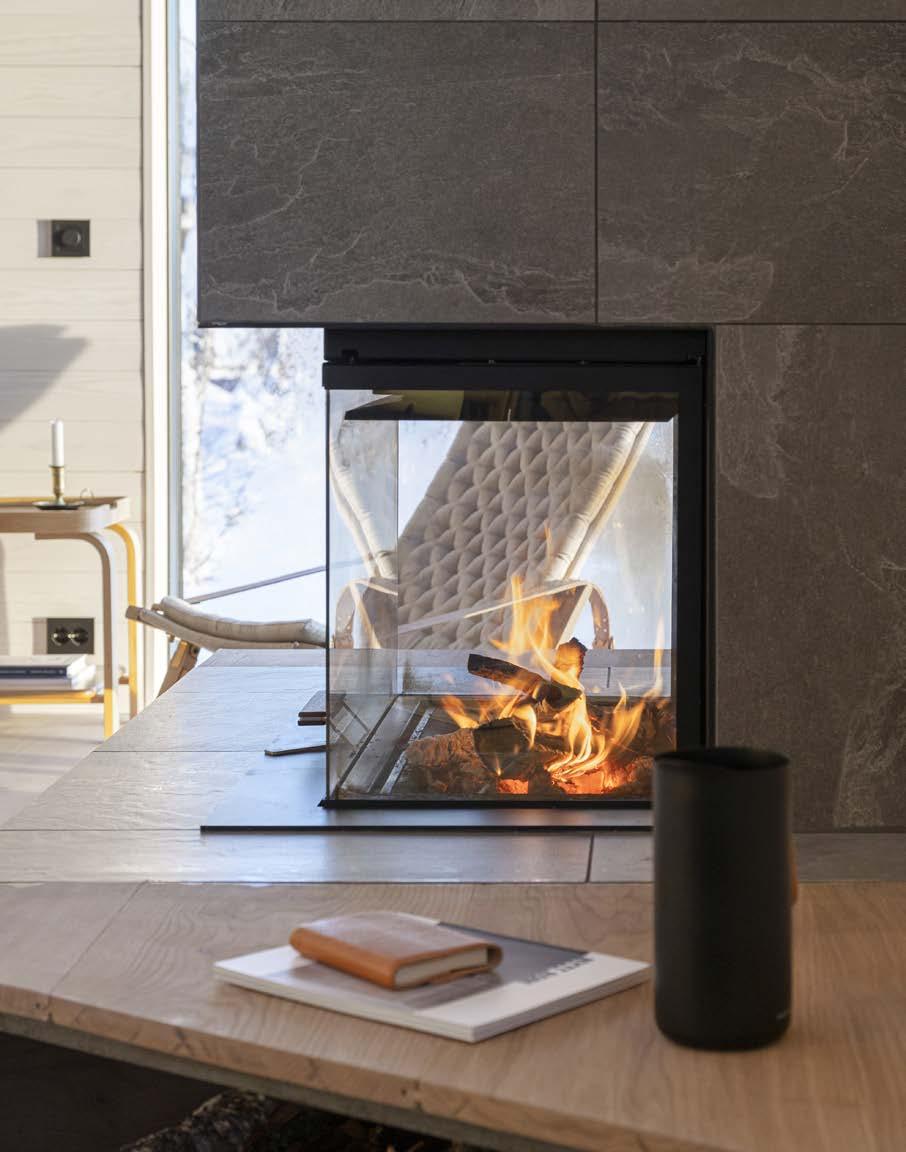 Med glas på tre sider kan du nyde ilden, uanset hvor du opholder dig i det store, lyse og højloftede rum.