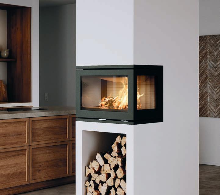 Visio 3:1 se caractérise par une profondeur supplémentaire, de larges vitres latérales et une vitre étroite au bout. Ce modèle est conçu pour être encastré dans un angle. Il fonctionne de manière optimale en tant que séparateur de pièces. Avec son design simple et épuré, il permet de voir le feu sans entraves de tous les côtés.