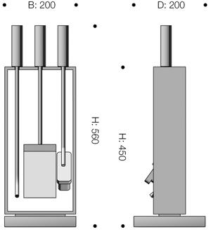 Outil pour cheminée en trois parties, en acier, fer et béton. Pour encastrement mural ou installation au sol. Poignée en acier inoxydable ou cuir.