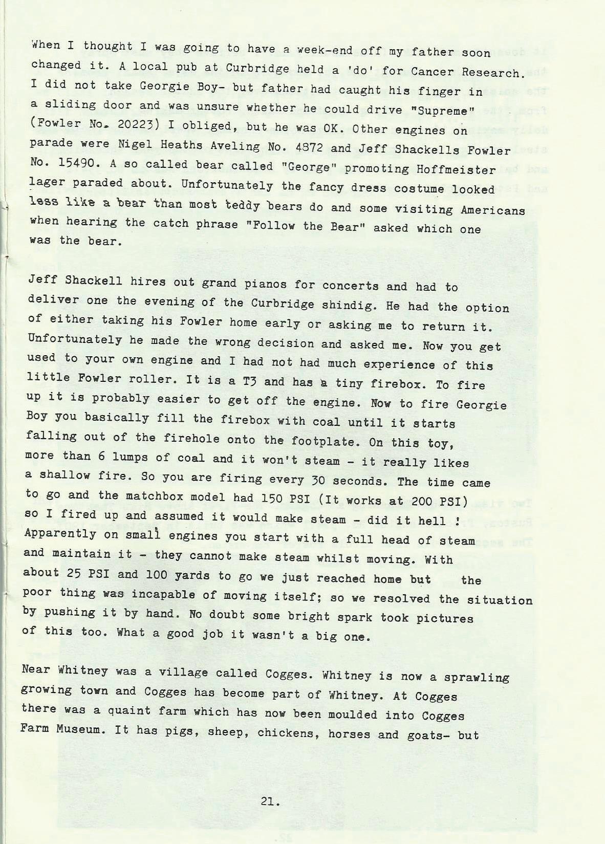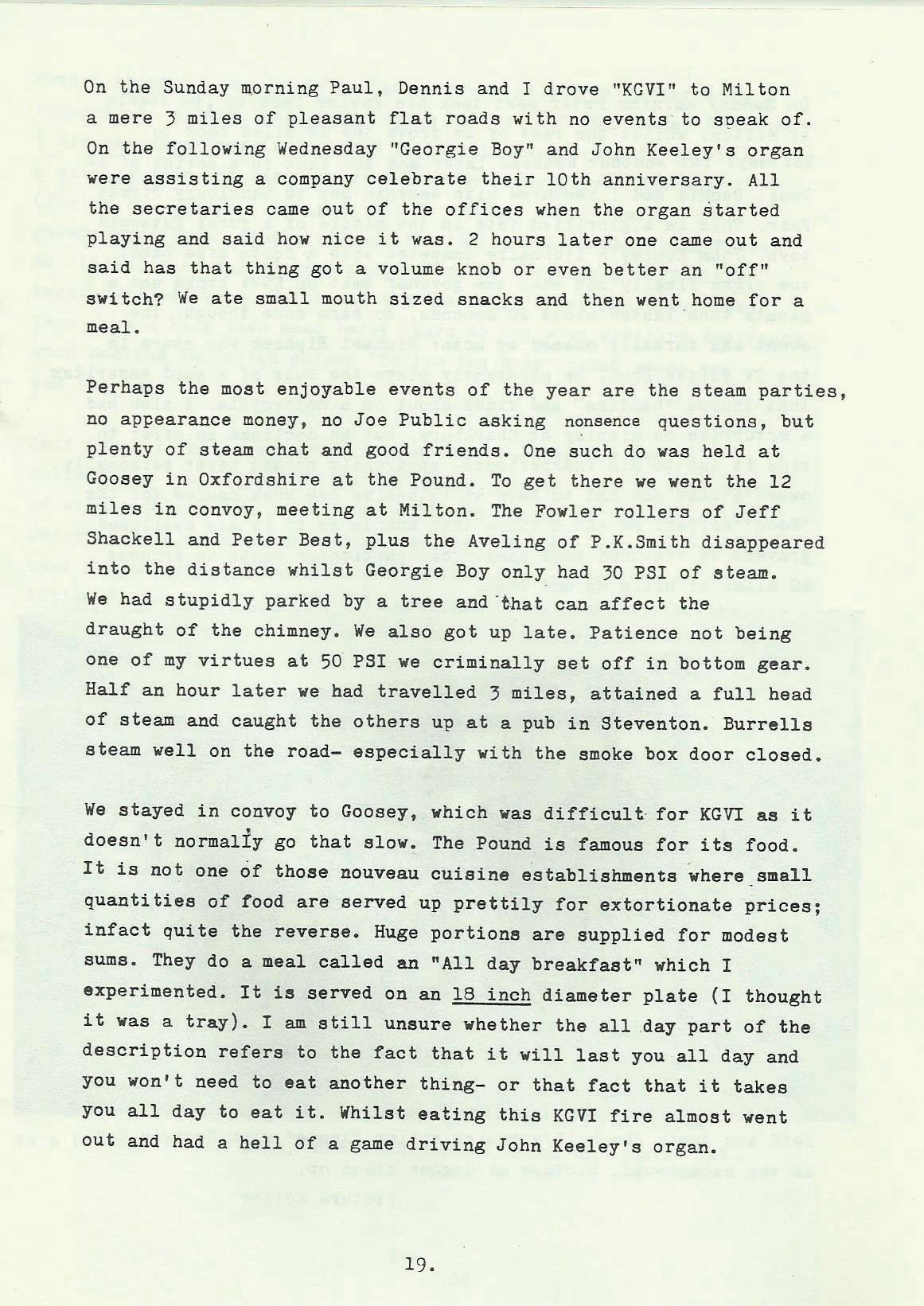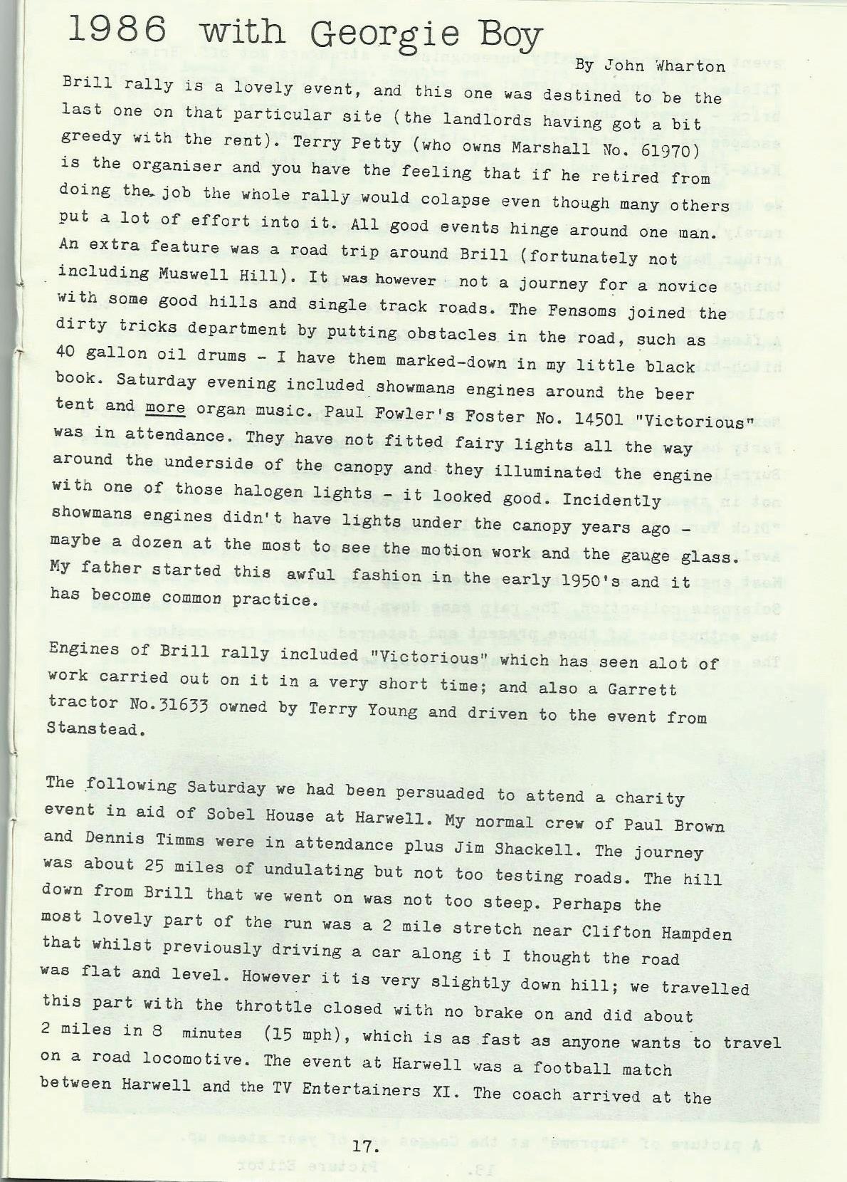 In this months newsletter we have the second part of John Wharton's article "1986 with Georgie Boy" and~ letter from Clive Hollingworth describing the 1986 Weeting event. To go vith his letter he sent me many photographs of which a selection are printed. Those who read Steaming regularly will know that Clive Hollingworth is a very good photographer and often has entries in their photogr~phic competition.