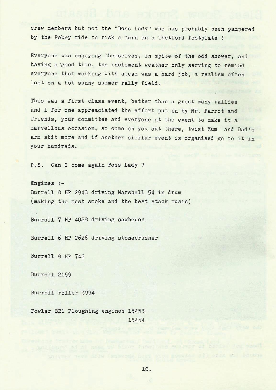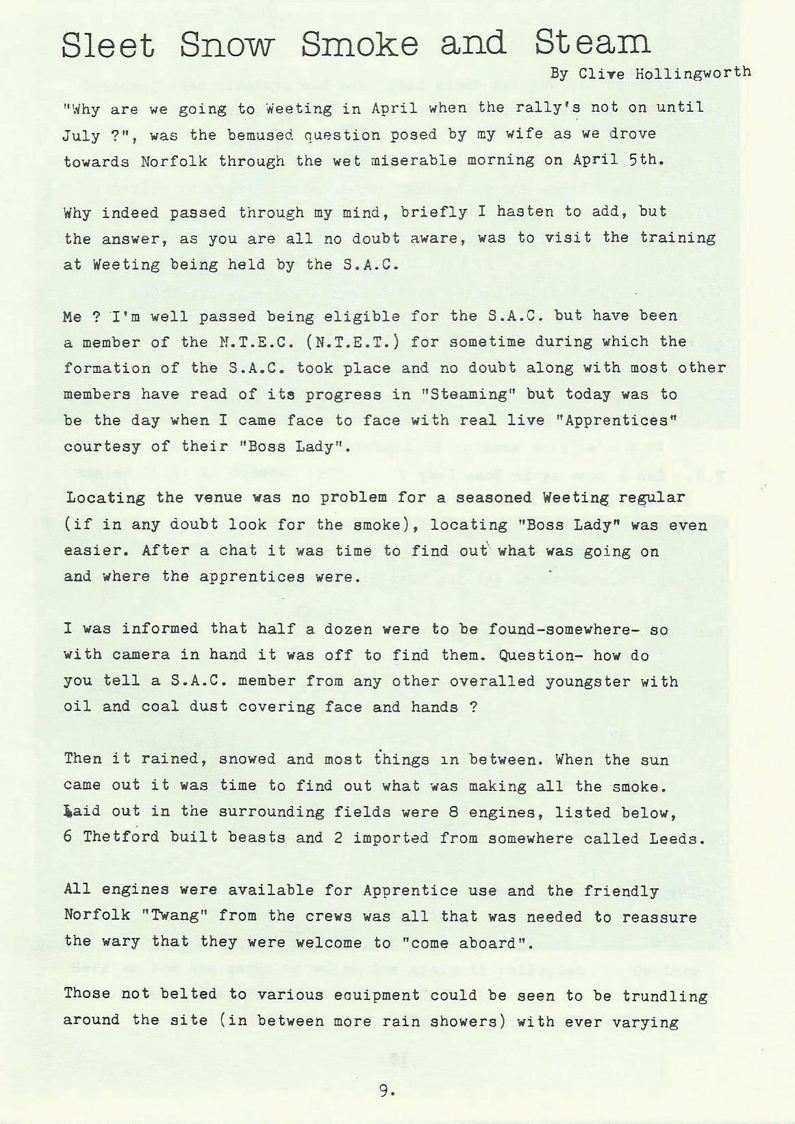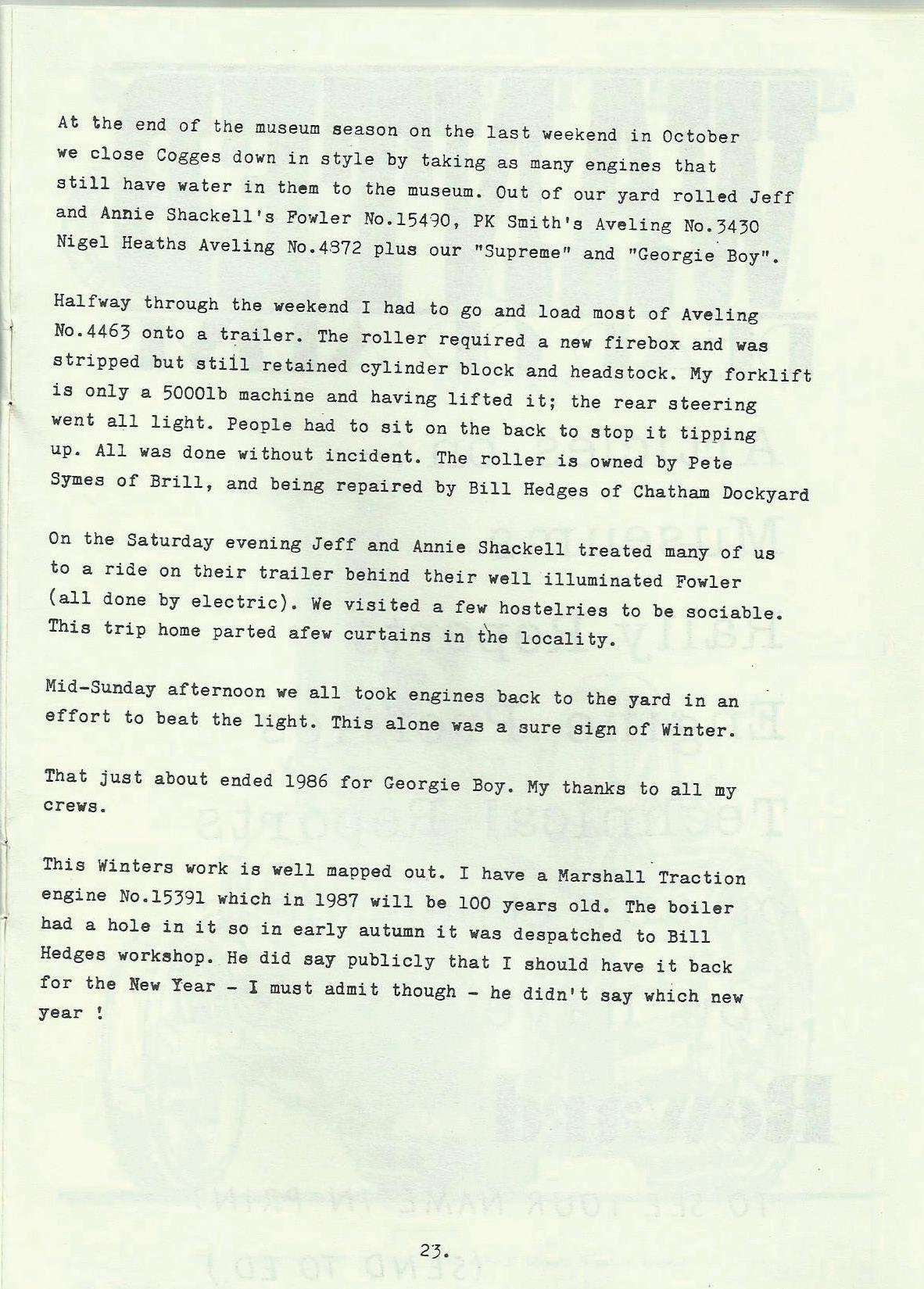 In this months newsletter we have the second part of John Wharton's article "1986 with Georgie Boy" and~ letter from Clive Hollingworth describing the 1986 Weeting event. To go vith his letter he sent me many photographs of which a selection are printed. Those who read Steaming regularly will know that Clive Hollingworth is a very good photographer and often has entries in their photogr~phic competition.