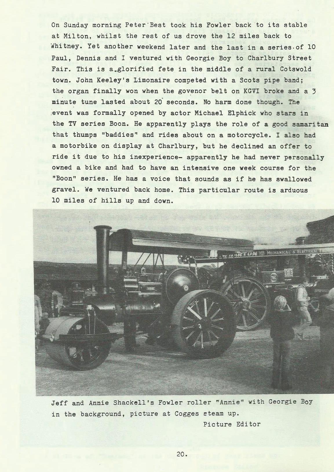 On Sunday morning Peter·Best took his Fowler back to its stable at Milton, whilst the rest of us drove the 12 miles back to Whitney. Yet another -weekend later and the last in a series.of 10 Paul, Dennis and I ventured with Georgie Boy to Charlbury Street Fair. This is a.glorified fete in the middle of a rural Cotswold town. John Keeley's Limonaire competed with a Scots pipe band; the organ finally won when the gov.enor belt on KGVI broke and a 3 minute tune lasted about 20· seconds. No harm done though. The ;event was formally opened by actor Michael Elphick who stars i.n the TV series Boon. He apparently plays the role of a good samaritan that thumps "baddies" and rides about on a motorcycle. I also had a motorbike on display at Charlbury, but he declined an offer to ride it due to his inexperience-apparently he had never personally o~ned a bike and had to have an intensive one week course for the "Boon" series. He has a voice that sounds as if he has swallowed gravel. We ventured back home. This particular route is arduous 10 miles of hills up and down.