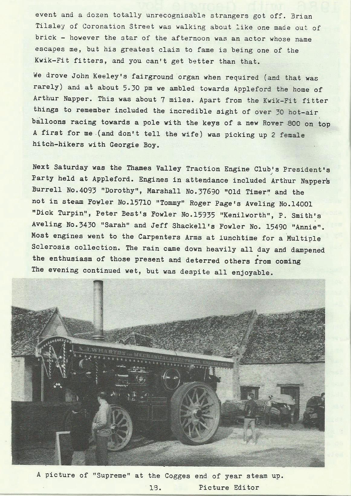 Next Saturday was the Thames Valley Traction Engine Club __ ' s President's Party held at Appleford. Engines in attendance included Arthur Nappers Burrell No. 4093 "Dorothy'', Marshall No. 37690 "Old Timer'~ and the not in steam Fo;'ler No.15710