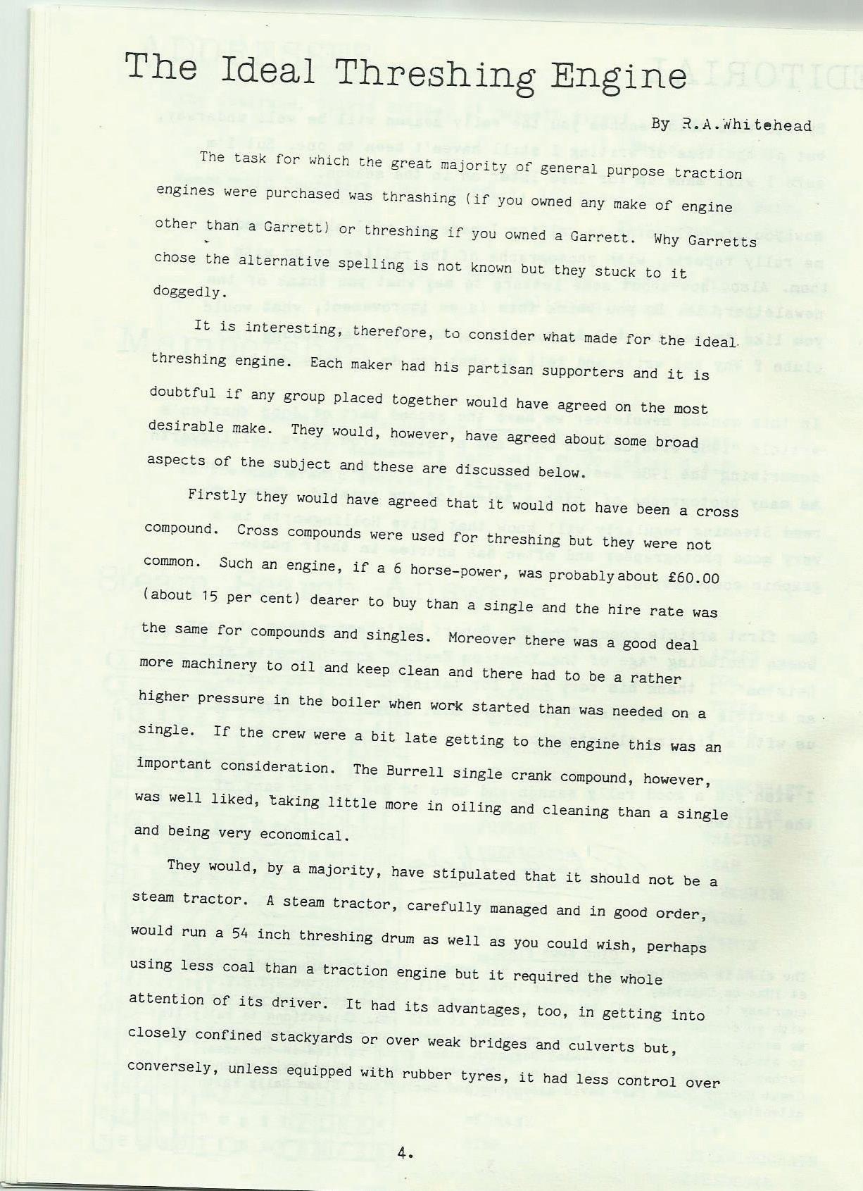Our first article comes from Mr. Robert ~hitehead author of many books including "Age of the Traction Engine" and "Garrette of Leisten". I thank him very much for taking the time to write an article for us, also I thank Mr. B.D. Stoyel for providing us with a fitting illustration.