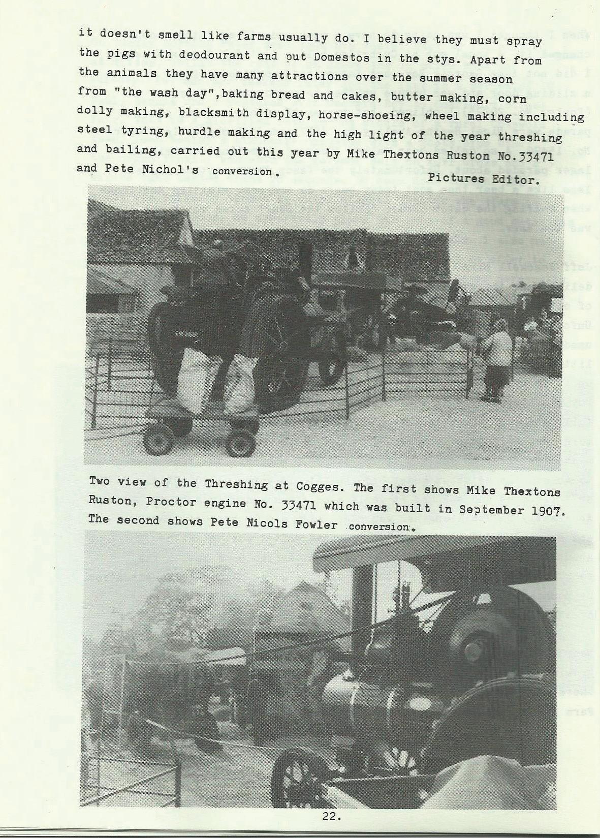 it doesn't smell like farms usually do. I believe they must spray the pigs with deodourant and 9ut Domestos in the stys. Apart from the animals they have many attractions over the summer season from "the wash day",baking bread and cakes, butter making, corn dolly making, blacksmith display, horse-shoeing, wheel making includi~g steel tyring, hurdle making and the high light of the year threshing and bailing, carried out thi~ year by Mike Thextons Ruston No.33471 and Pete Nichol's ·conversion. Pictures Editor.