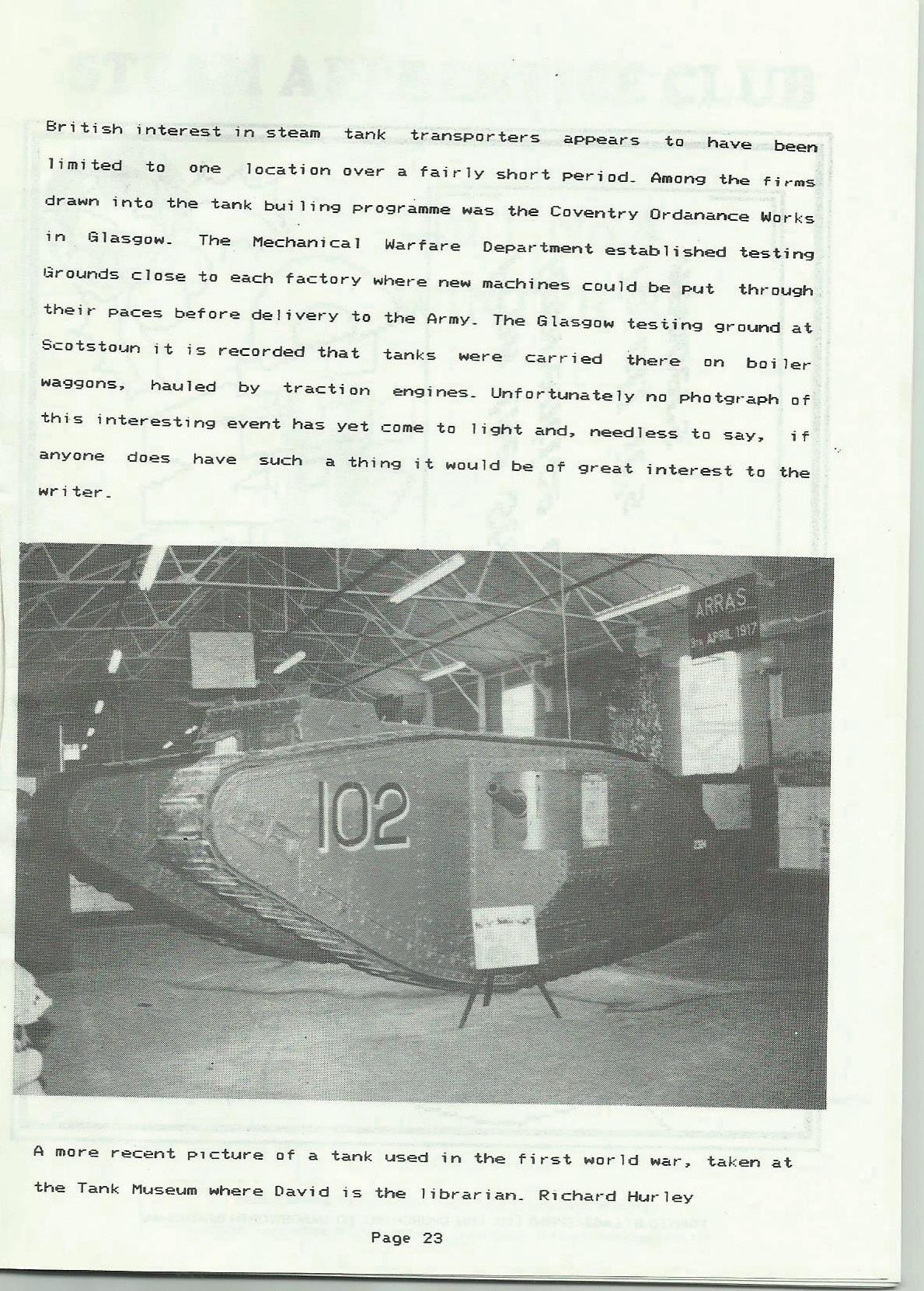 British interest in steam tank transporters appears to have been 1 i mi ted to one location over a fair-ly short period_ Among the fi.-ms drawn into the tank builing programme was the Coventry Ordanance Works in Glasgow_ The Mechanical Warfare Department established testing t.irounds close to each factory whet-e new machines could be put theit- paces before delive,-y to the Army_ The Glasgow testing ground at Scotsto,--'n it is recorded that tanks were carTied the,.-e on boi le,.waggons. hauled by traction engines_ Unfortunately no photgraph of this interesting event has yet come to light and, needless to say, if anyone does have such a thing it would be of great interest to the writer_