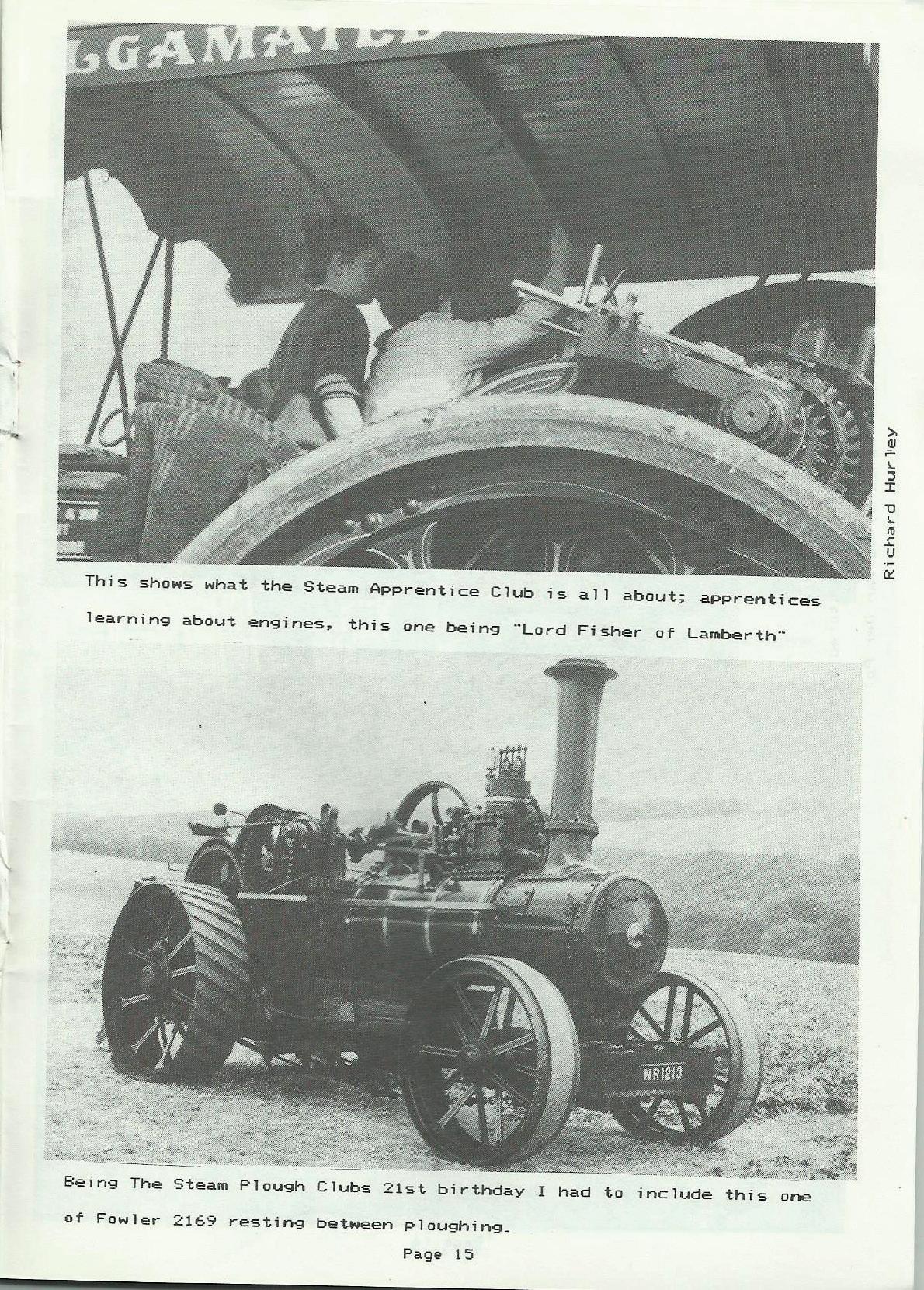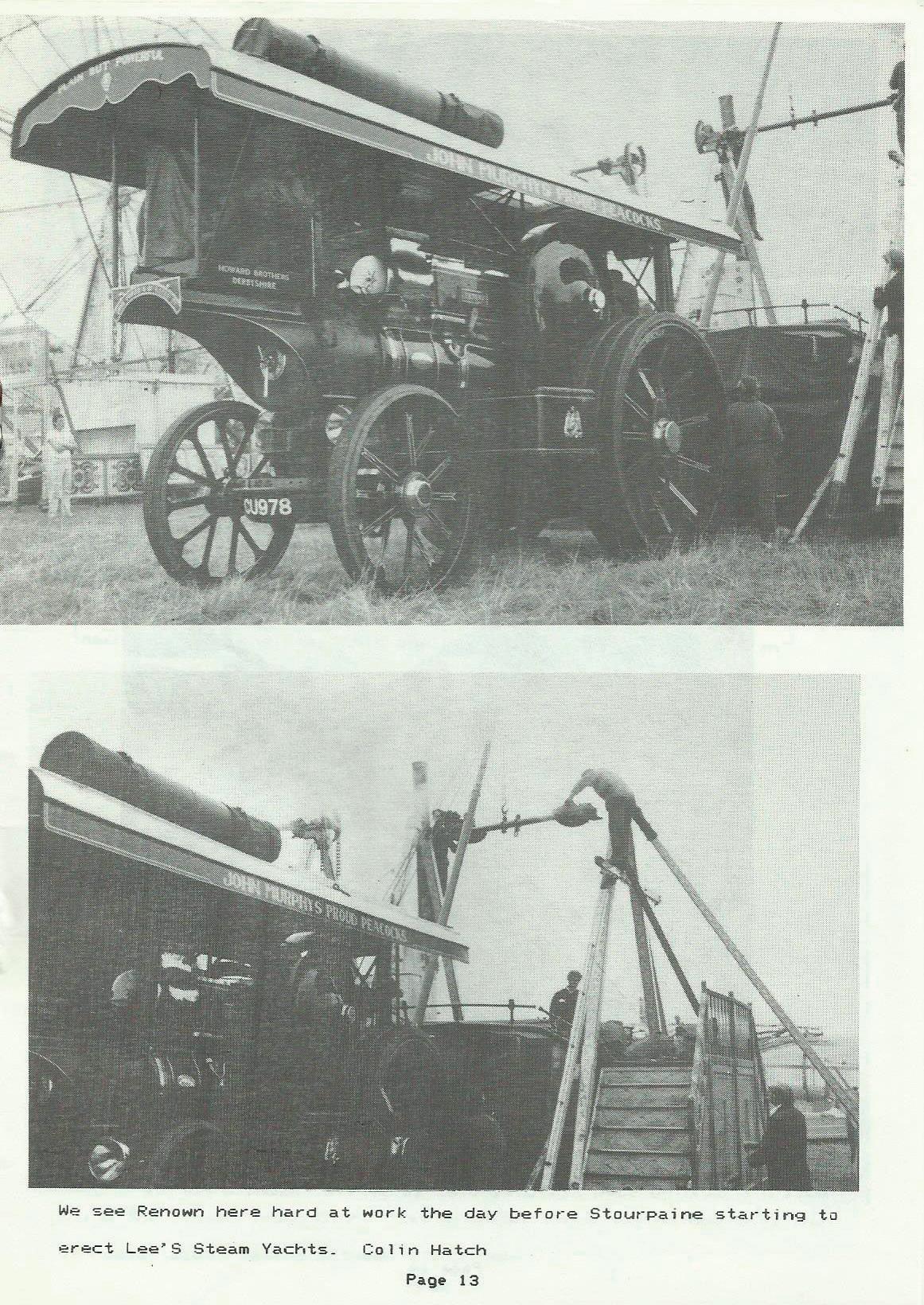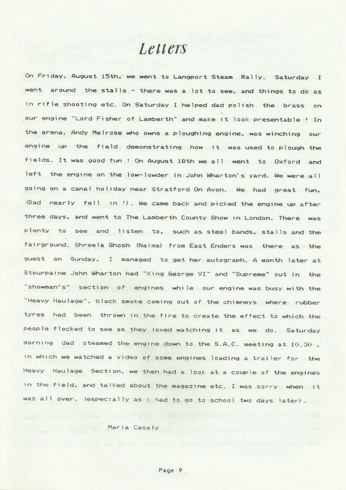 On Friday, August 15th,· we went to Langport Steam Rally_ Saturday I went around the stalls - there was a lot to see, and things to do as in r if 1e shooting etc_ On Satlffda.y I he 1ped dact po 1i sh the bt-ass on 01..1r engine "Lord Fisher of Lamberth'" and make it 1ook pt·esentab le In the arena, Andy Melrose who owns a ploughing engine, was winching ourengine 1.1p the field demonstrating how it was used to plough the fields_ It wa.s 900d fun On A1..1gust 18th we a 11 went to Oxford and left the en-;iine on the low-lowder in John Wharton's yard_ We were all going on a canal holiday near Stratford On Avon_ We had gre.at fun, <Dad nearly fe 11 in !) _ We came back and picked the engine up after three days, and went to The Lamberth County Show in London_ There was plenty to see and 1 i sten to, such as steel bands, stalls and the fairground_ Shreela Ghosh (Naima) from East Enders was there as the guest on Sunday, I managed to get her autograph_ A month later at Stourpaine ~'ohn What-ton had "King George VI" and "Supreme" out in the ··showman's·· section of engines while our engine was busy with the "Heavy Haulage", black smoke coming out of the chimneys wher-e r·ubber tyres had been thrown in the fire to create the effect to which the people flocked to see as they loved watching it as we do_ Satut·day morn1ng dad steamed the eng1ne down to the S_A_C_ meeting at 10_30.