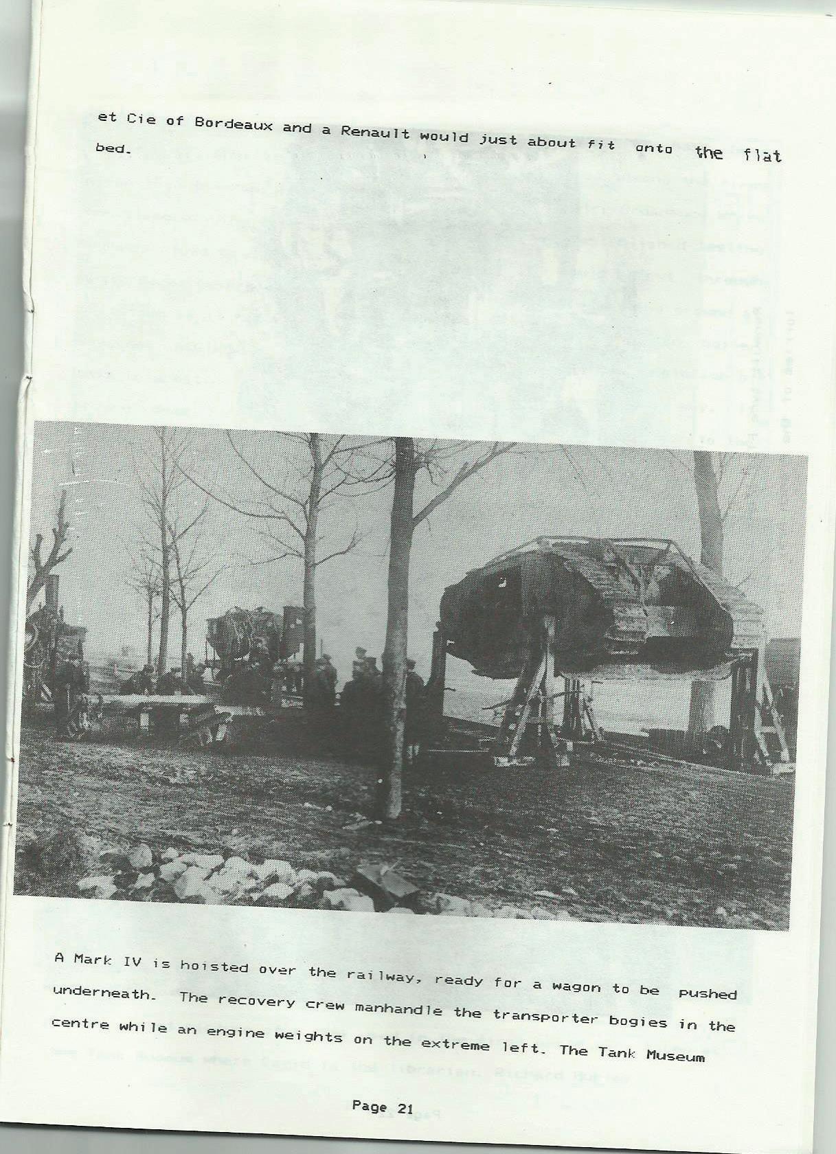 The type of tank used at Cambrai was the Mark IV_ Apat·t from a few detail improments it differed little from those used on the Somme a year earlier. However like those earlier tanks7 and many later ones it was a difficult thing to move one when i t was not in r·unn i ng order_ The 13ermans developed a robust but simple form • of transporter which consisted of a subframe running on two parrallel rollers_ These were supported in external axleboxes 7 like railway wagons, but appar-ently unsprung_ Two such subframes were used to move one tank, supporting it close to each end and chained together to prevent the whole ensemble from col lapsing_ Motive power was provided by a traction engine, possibly a German built Kemna like the one photographed in Fontaine, or any suitable type_ Obviously the ground from which the tanks could be recovered had to be chosen carefully but the area around Cambrai was relatively free from the effects of heavy bombardment and, being mainly chalk downland, quite well drained_