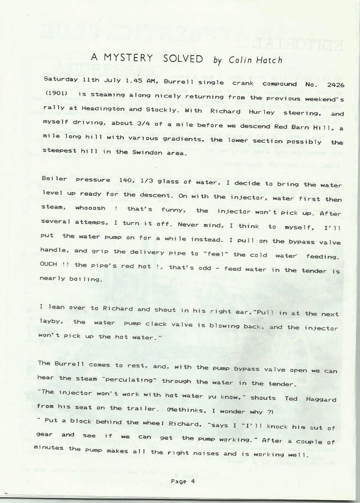 The Burrell comes to rest, and, with the pump bypass valve open we can hear the steam ""perculating" through the watet- in the tender_ ""The injector won·· t work with hot water yu know,·· shouts Ted Hagg.ard from h1 s seat on the tra i le,-_ (Methinks, I wonder why ?)