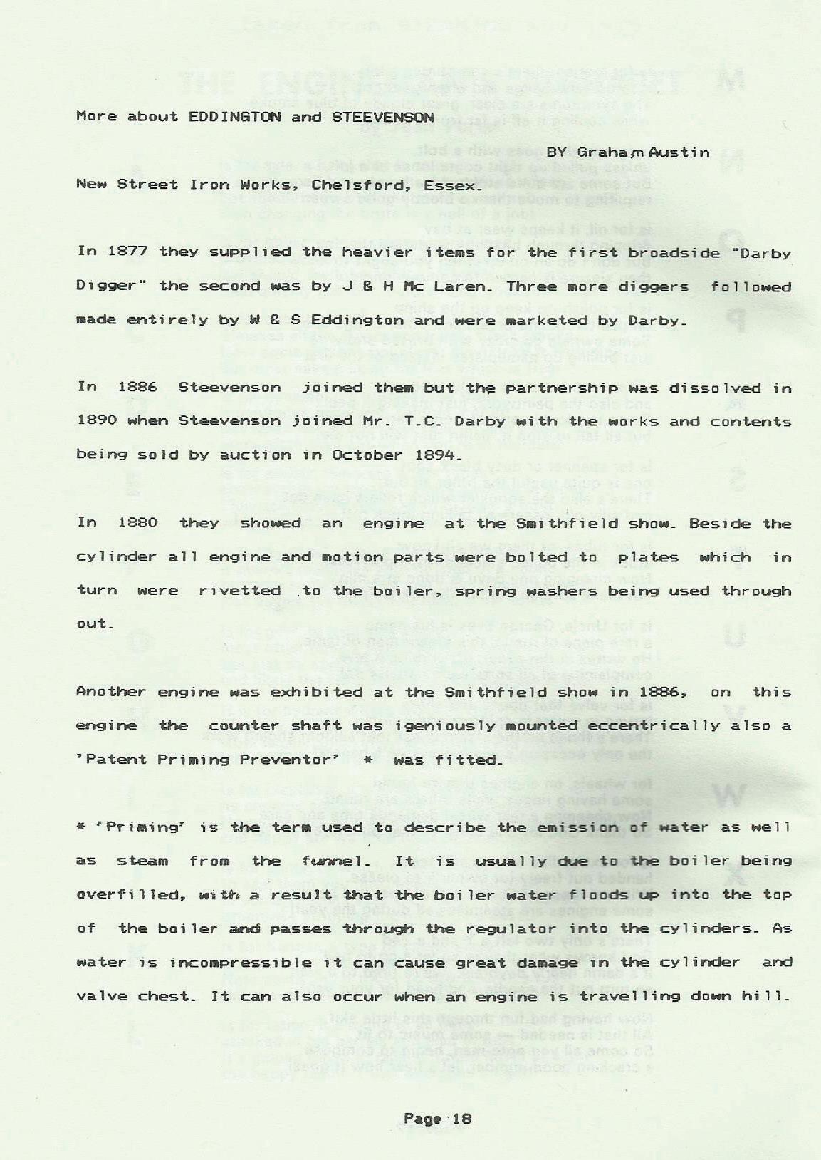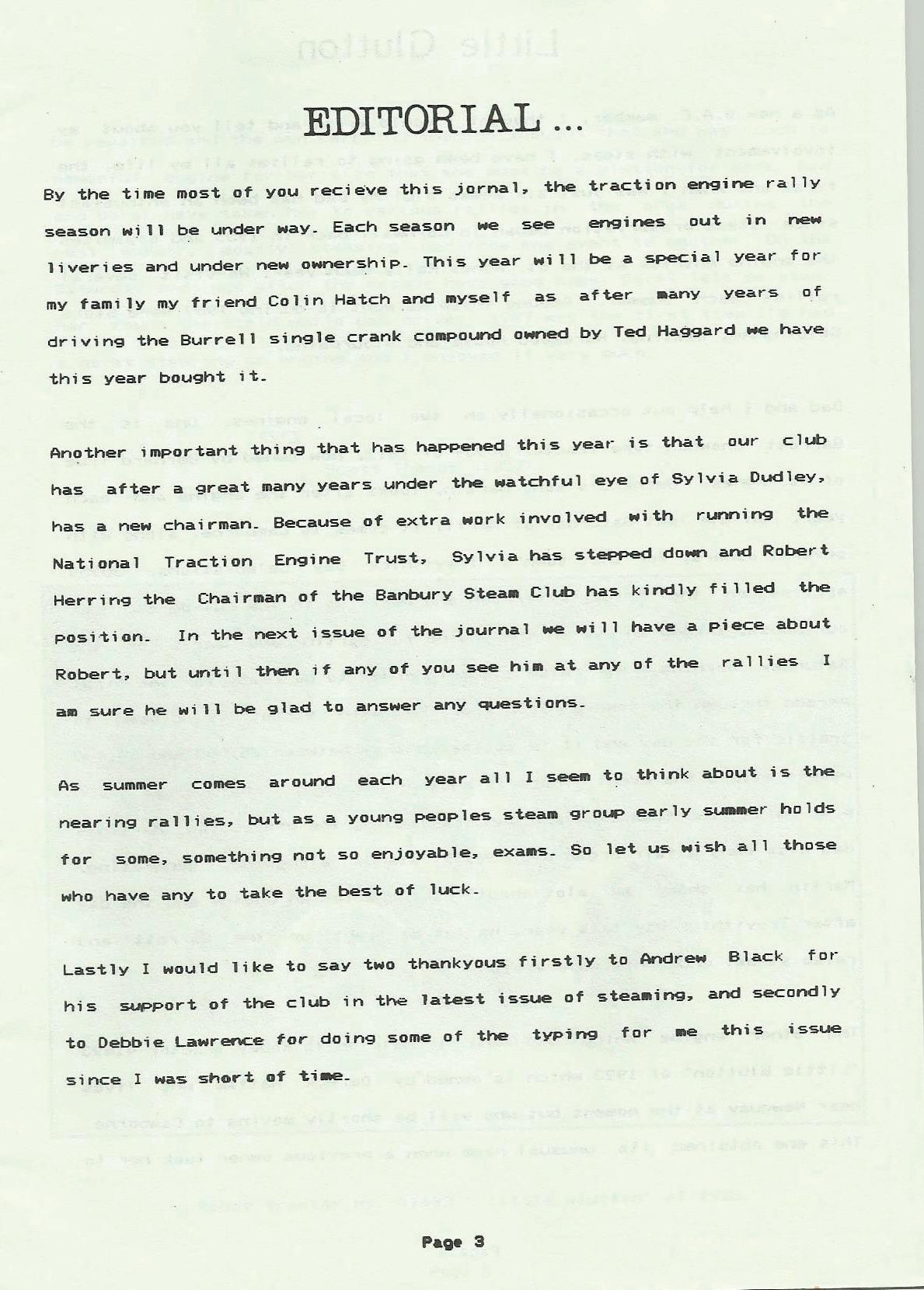 By the time most of you recieve this jornal, the traction engine rally season wjll be under way. Each season Ne see engines out in new liveries and under new ownership. This year will be a special year tor my family my friend Colin Hatch and Myself as after aany years of driving the Burrell single crank coapound owned by Ted Haggard we have this year bought it.