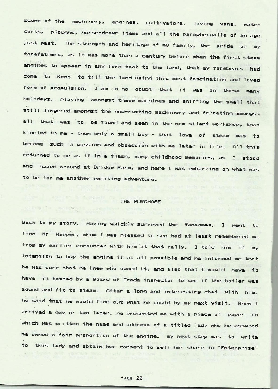 Back to my story_ Having quickly surveyed the Ransoaes, I went to find Mr Napper,. wholl' I was pleased to see had at least reaelftbered ae from my earlier encounter with hi•'at that rally_ I told hi• of •Y intention to buy the engine if at all possible and he infonned ae that he was· sure that he knew who owned it, and also that I would have to have it tested by a Board of Trade inspector to see if the boiler was sound and tit to steam_ After a long and interesting chat with he said that he would find out what he could by •Y next visit_ When I arrived a day or two later,. he presented ae with a piece of paper on which was wr1tten the name and address of a titled lady who he assured me owned a fair proportion of the engine_ •Y next step was to write to this lady and obtain her consent to sell her share in "Enterprise"