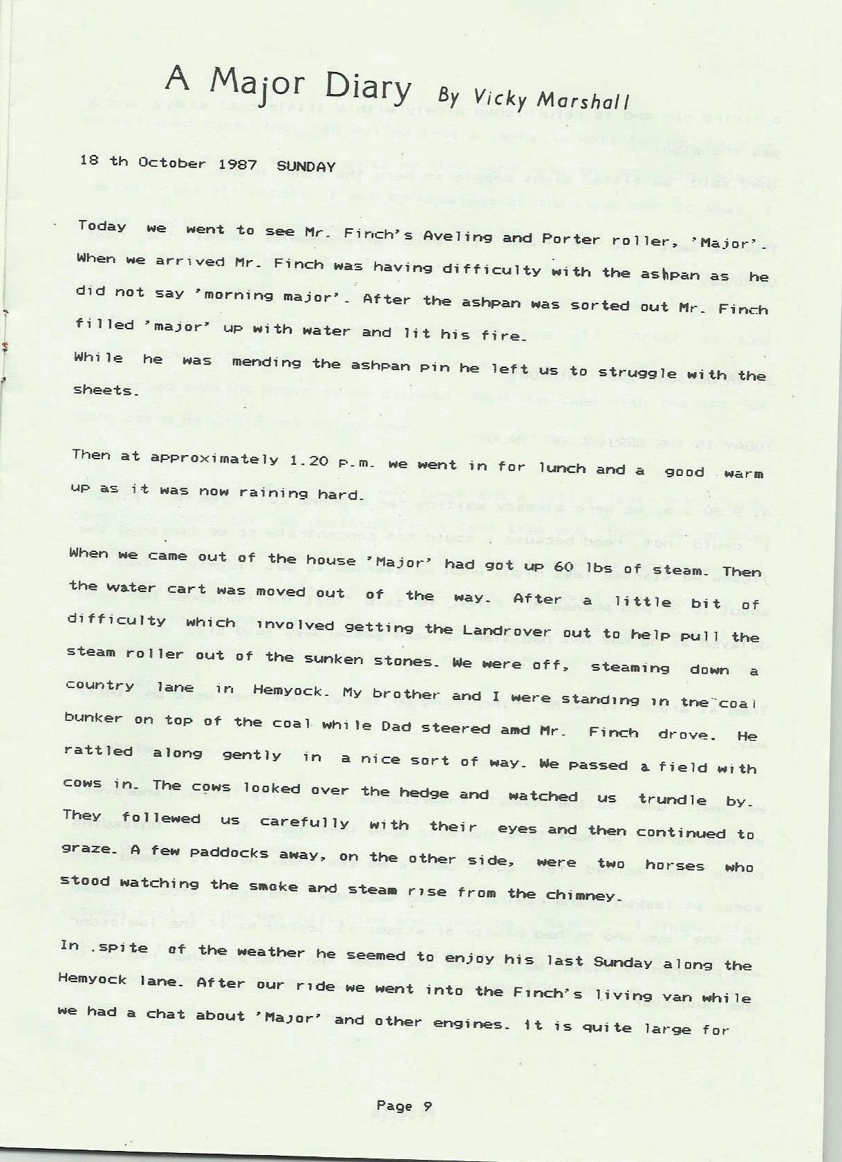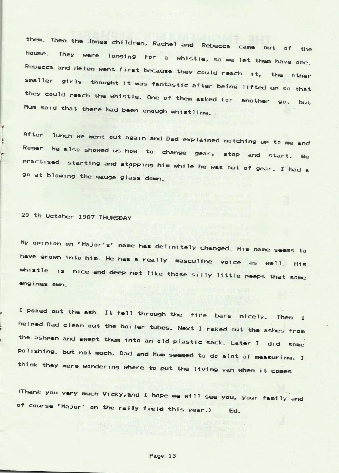 be repaired and the man carrying the job thought that she was such a powerful engine for her s;ze that she Must be a glutton for work. Dad and Derek have taken her to various rallies in the area during the past Summer~ mostly steaming her frosn one event to another·_ On the Saturday even; ngs after the crowds have gone home, Derek lets me steer· her round the field while dad drives. 1987 was the first t'iae I'd had a go at steering an eng1ne and I enjoyed it very auch.