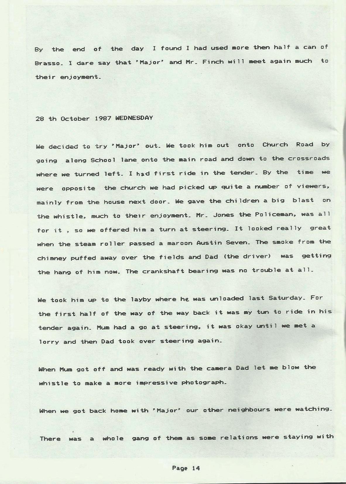 We decided to try 'Major• out_ We took him out onto Church Road by going along School lane onto the main road and down to the crossroads where we turned left_ I h~d first ride in the tender_ By the tiae we were opposite the church we had picked up quite a numbet- of viewers, mainly from the house next door_ We gave the children a big blast on the whistle, much to their enjoyment_ Mr_ Jones the Policeman, was all for it, so we offered him a turn at steering_ It looked really great when the st.eam roller passed a maroon Austin Seven_ The saoke from the chimney puffed away over the fields and Dad (the driver) was getting the hang of h1m now_ The crankshaft bearing was no trouble at all_