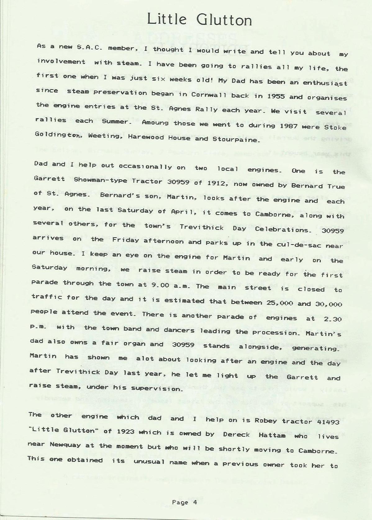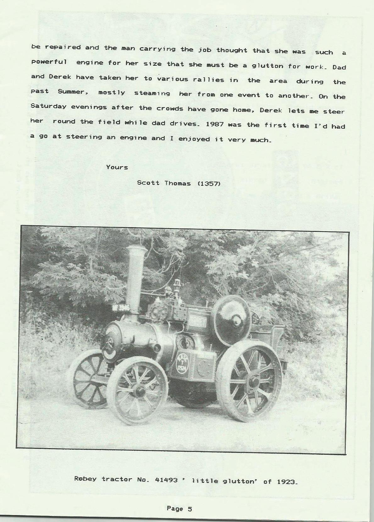 The other engine which dad and I help on is Robey tractor 41493 -Litt le Glutton of 1923 Mhi eh is owned by Det·eck Hatta• who 1ives near Newquay at the moment but Nho will be shortly to Camborne. This one obtained its unusual name when a previous owner took het· to