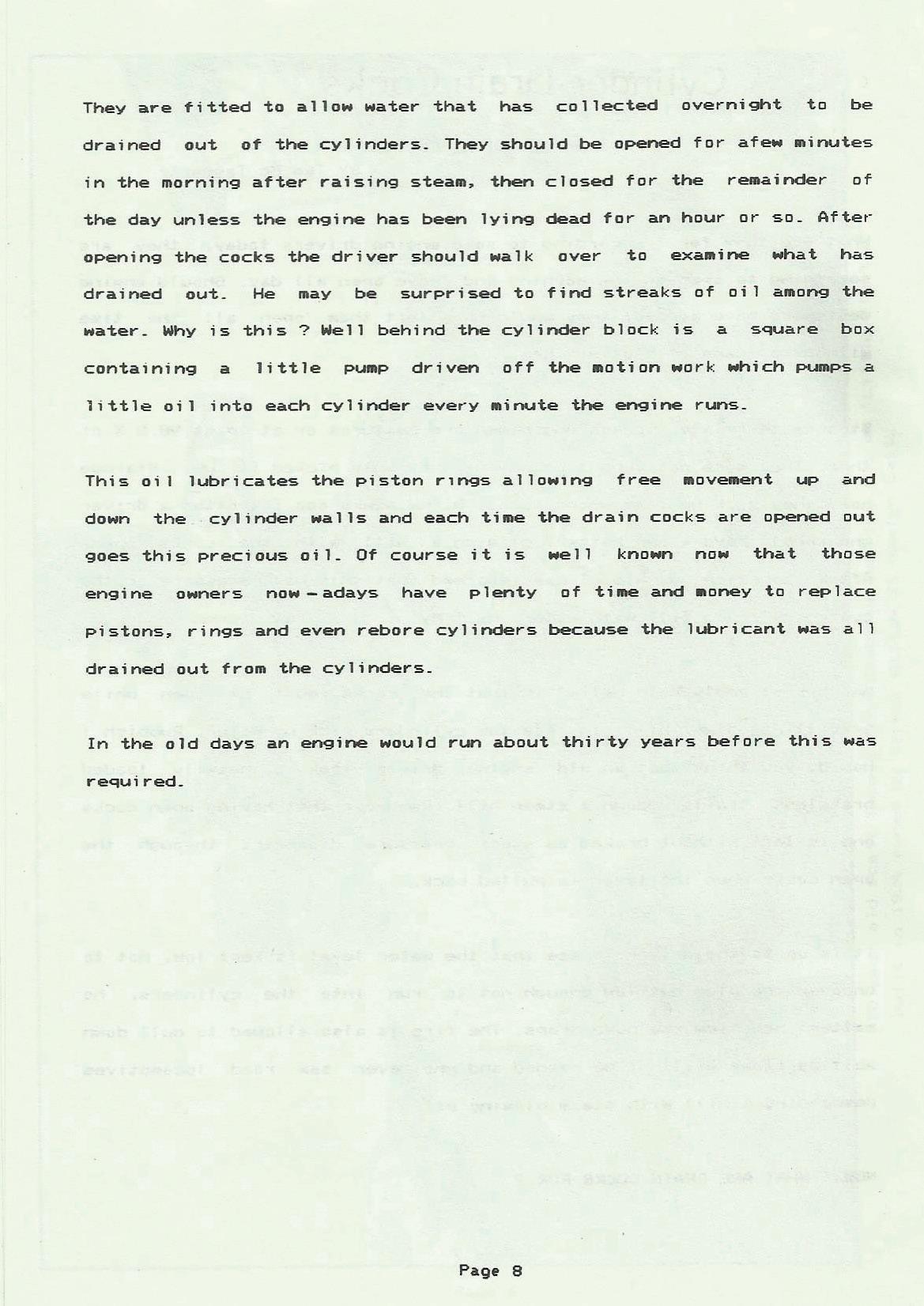 They are fitted to allow water that has collected overnight to be drained out of the cylinders_ They should be opened for afew in"inutes in the morning after raising steam, then closed for the remainder of the day unless the engine has been ly"ing dead for an hour or so_ Afteropening the cocks the driver should walk over to examine what has drained out_ He may be surprised to find streaks of oil among the water_ Why is this ? Wel 1 behind the cylinder block is a square box containing a Jittle pump driven off the motion work which pumps a little oil into each cylinder every 111inute the engine runs_