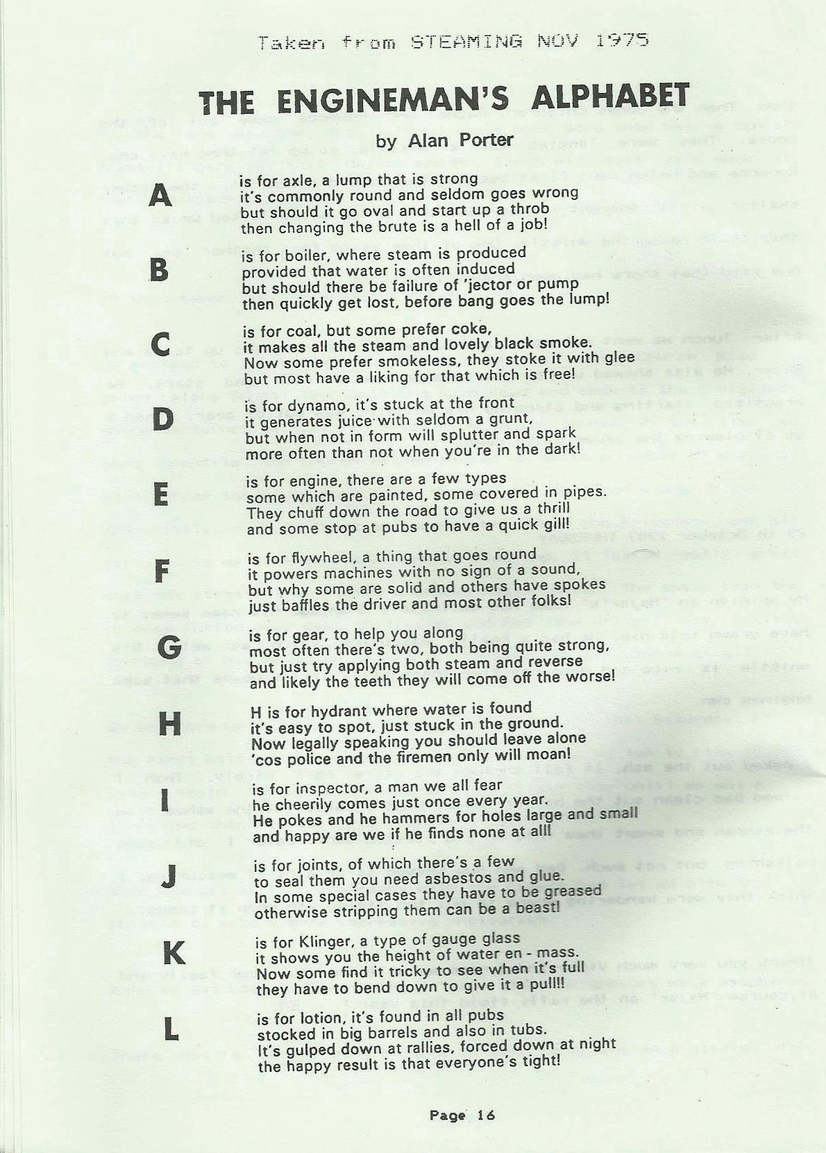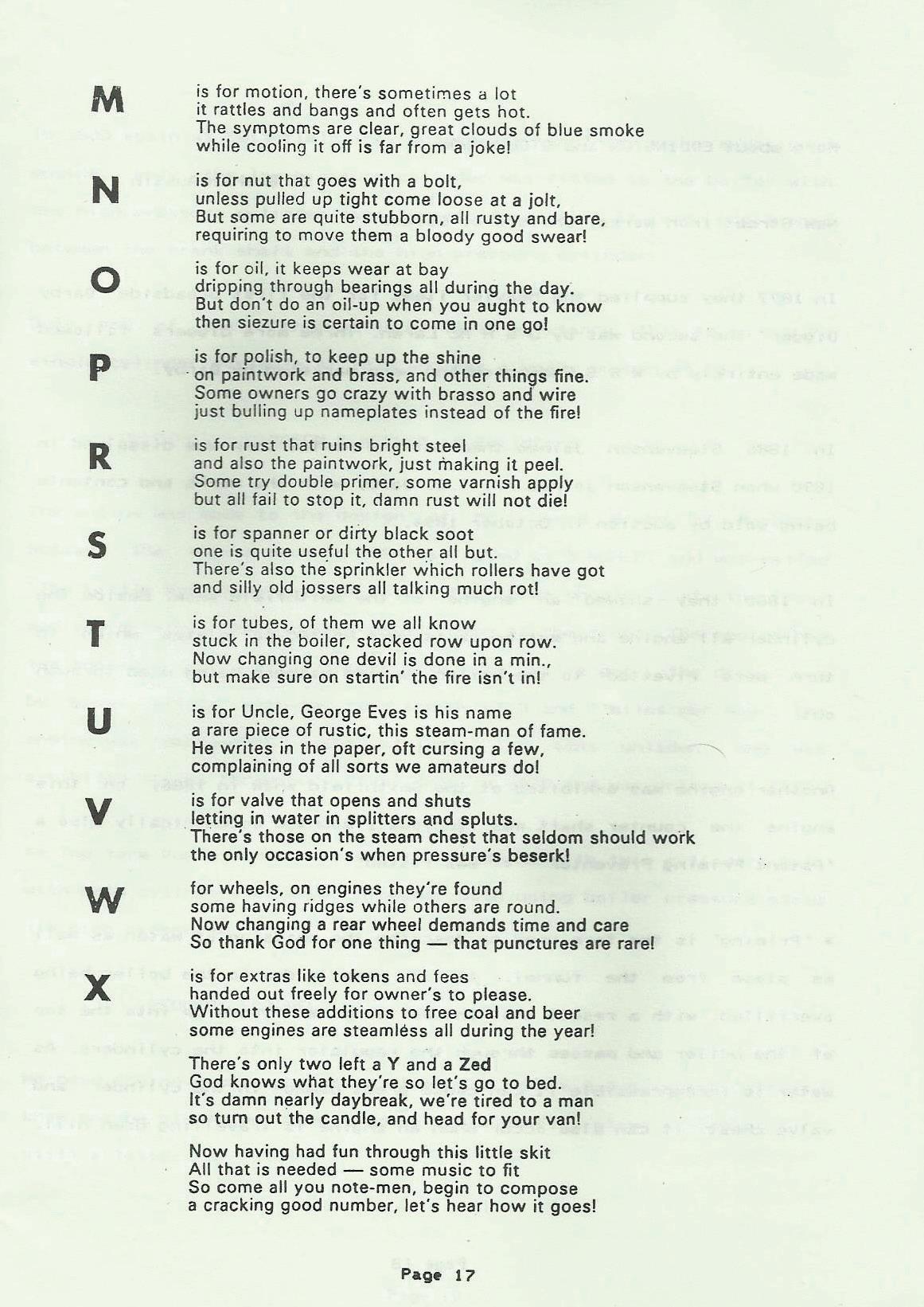 is for valve that opens and shuts letting in water in splitters and spluts. . •There's those on the steam chest that seldom should work the only occasion's when pressure's beserk! for wheels. on engines they're found some having ridges while others are round. Now changing a rear wheel demands time and care So thank God for one thing - that punctures are rare!