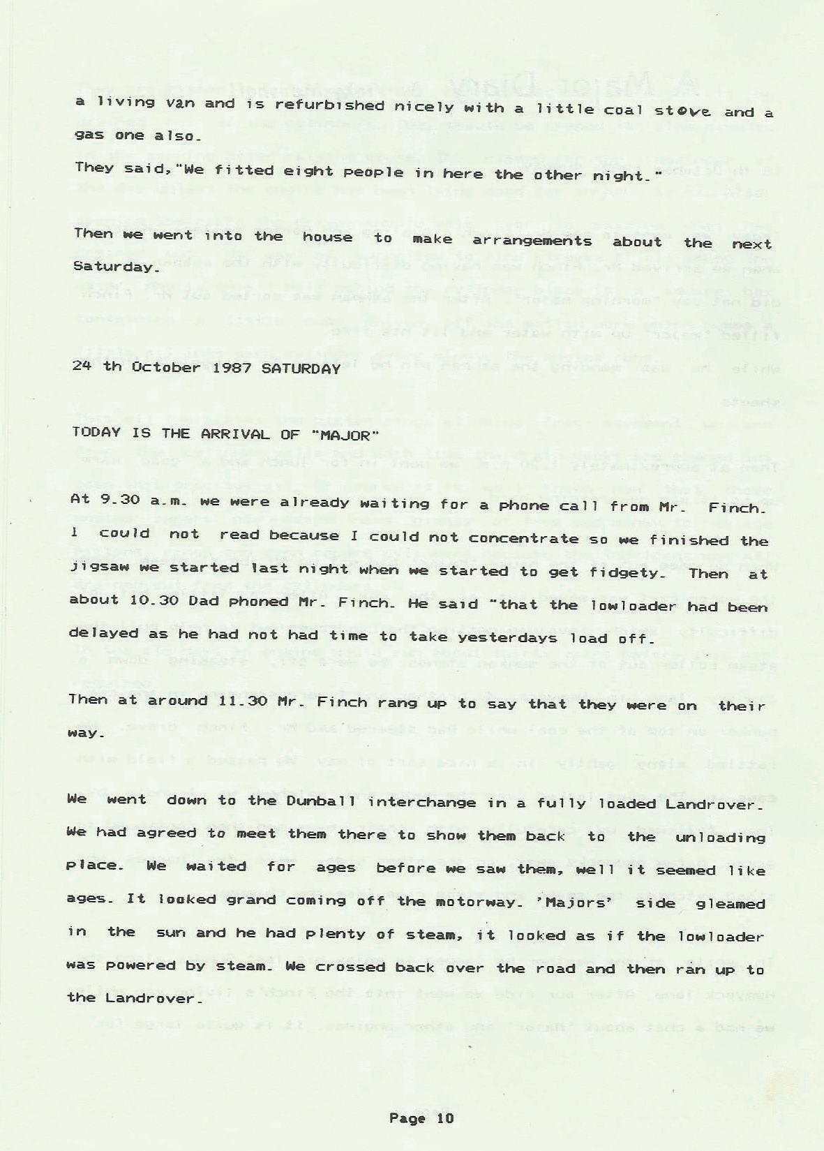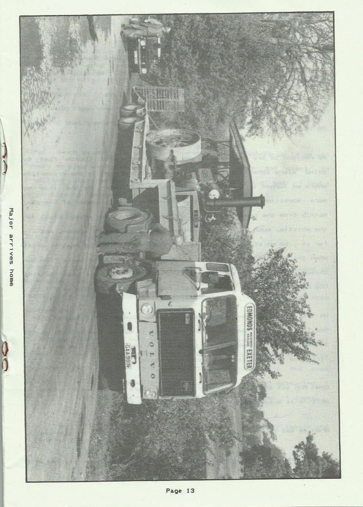 We went down to the Dunball interchange in a fully loaded Landrover. We had agreed to meet them there to show them back to the unloading place. We Naited for ages before we saw the•7 well it seemed like ages. It looked grand coming off the •otorway. 'Majors' side gleamed in the sun and he had plenty of stea•~ it looked as if the lowloader was powered by steam. We crossed back over the road and then ran up to the Landrover_