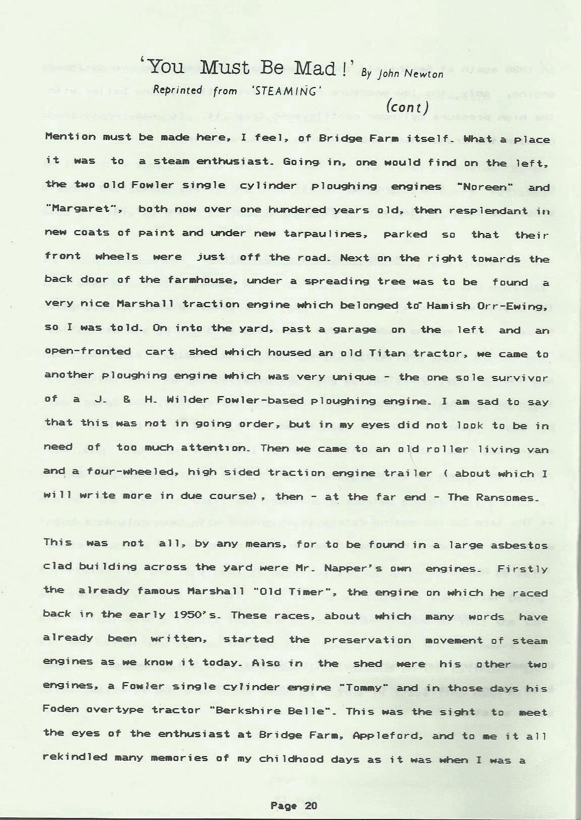 scene of the mach;nery, eng;nes,. cultivators,. living vans,. water carts, p'loughs, horse-dral«l i teas and a 11 the parapherna 1 i'a of an age just past_ The strength. and heritage of ay faaily, the pride of ay forefathers,. as it was •ore than a century before Mhen the first steam engines to appear in any form took to the land,. 'that ay forebears had come to Kent to ti 11 the land usfr)9 this aost fascinating and loved form of propUlsion_ I aa in no doubt that it was on these aany ho 1 i days, play1ng aaongst these aachines and sniffing the saell that sti 11 1 ingered aaongst the now-rusting ;aachinery and ferreting aaongst all that was to be found and seen in the now silent workshop, that kindled in me - then only a small boy - 'that love of stea• was to become such a passion and obsession with ae later in life_ All this ·returned to me as if in a f·lash, many childhood aeaories, as I stood and gazed around at Bridge Farm, and here I was eabarking on what .as to be for iae another exciting adventure_
