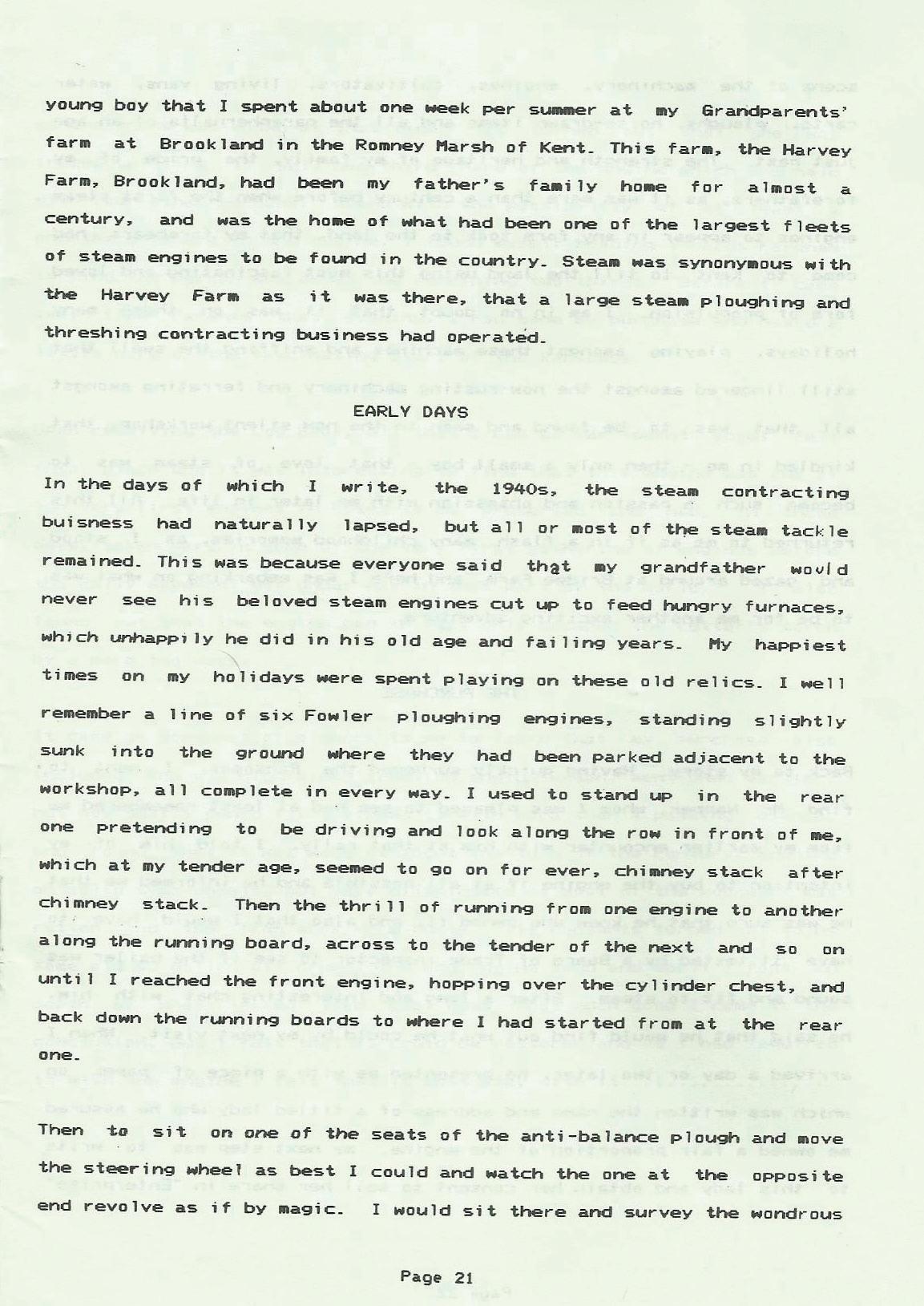 young boy that I SPent about one week per suaaer at my Grandparents• farm at Brookland in the Romney Narsh of Kent_ This fara, the Harvey Farm,. Brookland,. had been my father's faaily hoae for almost a century, and was the hoae of what had been one of the largest fleets of steam eng1nes to be found in the country_ Stea• was synonymous with "the Harvey Far• as it was there,. that a large steaa ploughing and threshing contracting business had operated_