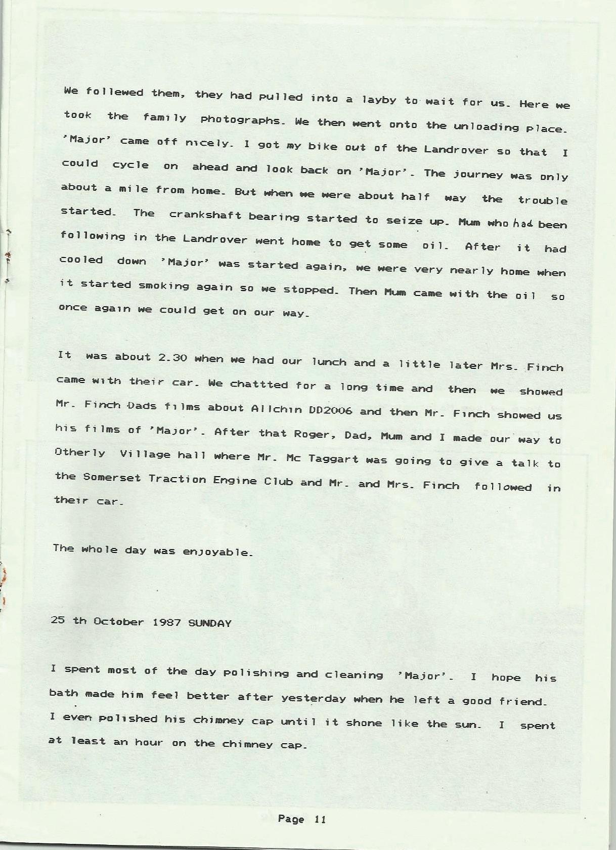We tollewed them. they had pulled into a layby to-wait for us_ Here we took the family photographs_ We then went onto the unloading place_ >Major• came off n,cely. 1 got my bike out of the Landrover so that I could cycle on ahead and look back on 'Major'- The journey was only about a mile from home_ But when ..e were about half Nay the trouble started_ The crankshaft bearing started to seize UP- Mum who had. been following in the Landrover went hoae to get soae oil_ After it had cooled down 'Major' was started again, we were very nearly home when it started smoking again so we stopped_ Then Ml.an caae with the oil so once aga1n we could get on our way_