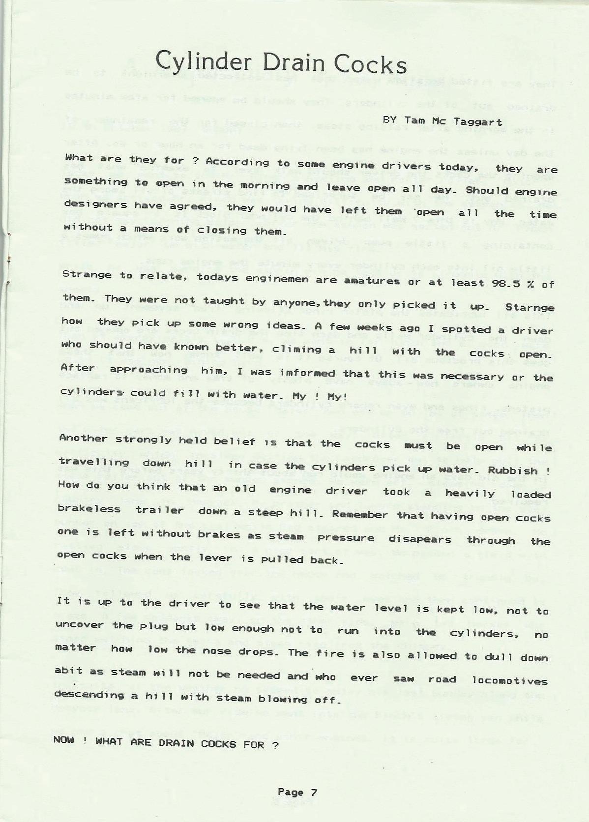 Another strongly held belief 1s that the cocks aust be open while travelling down hill in case the cylinders pick up water_ Rubbish! How do you think that an old engine driver took a heavily loaded brakeless trailer down a steep hill. Remeaber that having open cocks one is left without brakes as steam pressure disapears through the open cocks when the lever is pulled back_