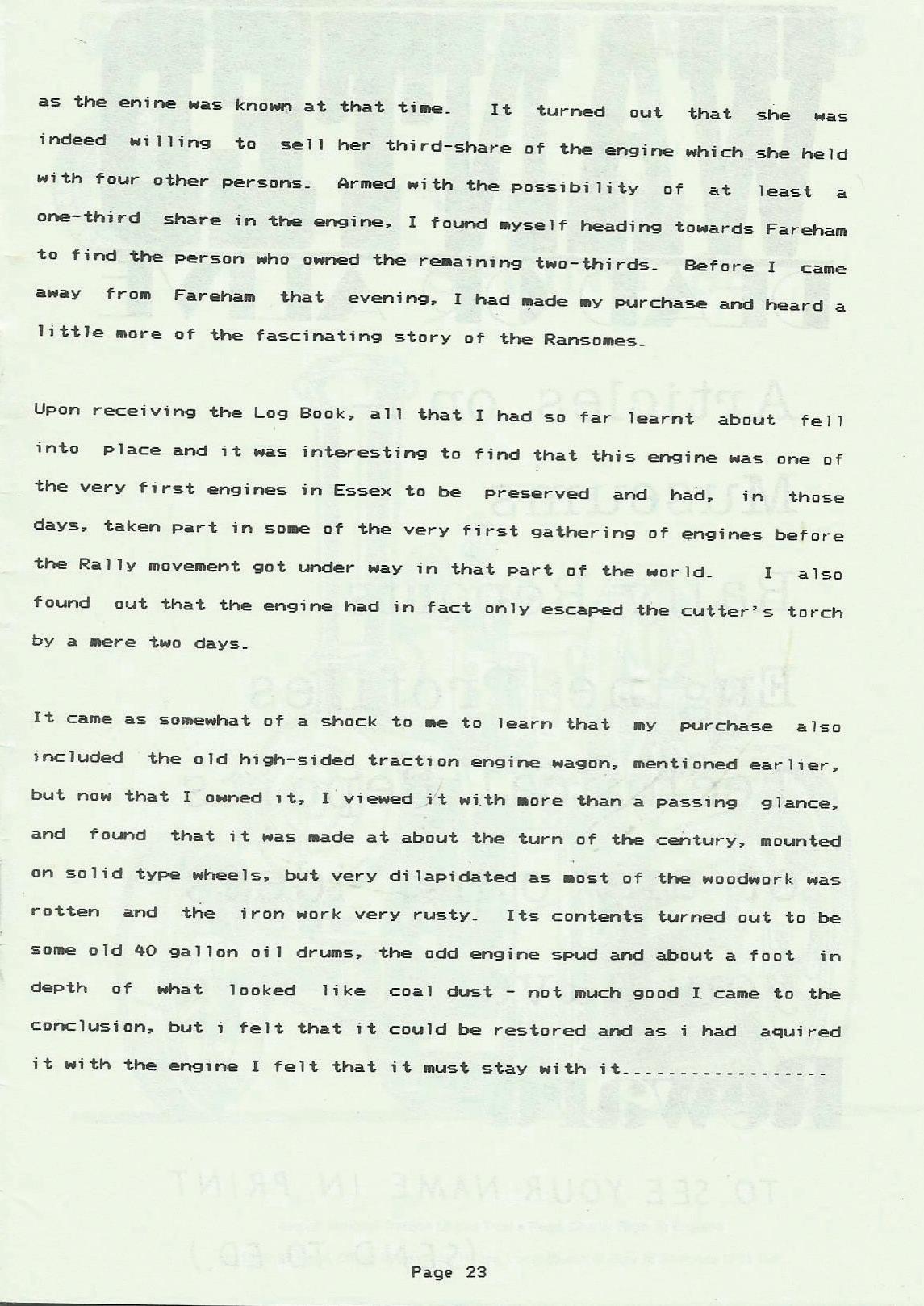 as the enine was known at that time_ It turned out that she was indeed willing to sell her third-share of the engine which she held with four other persons_ Armed with the possibility of at least a one-third share in t.he engine,. I found ayself heading towards Fareham to find the person who owned the remaining two-thirds_ Before I came away from Fareham that evening,. I had ~ade ay purchase and heard a little more of the fascinating story of the Ransomes_