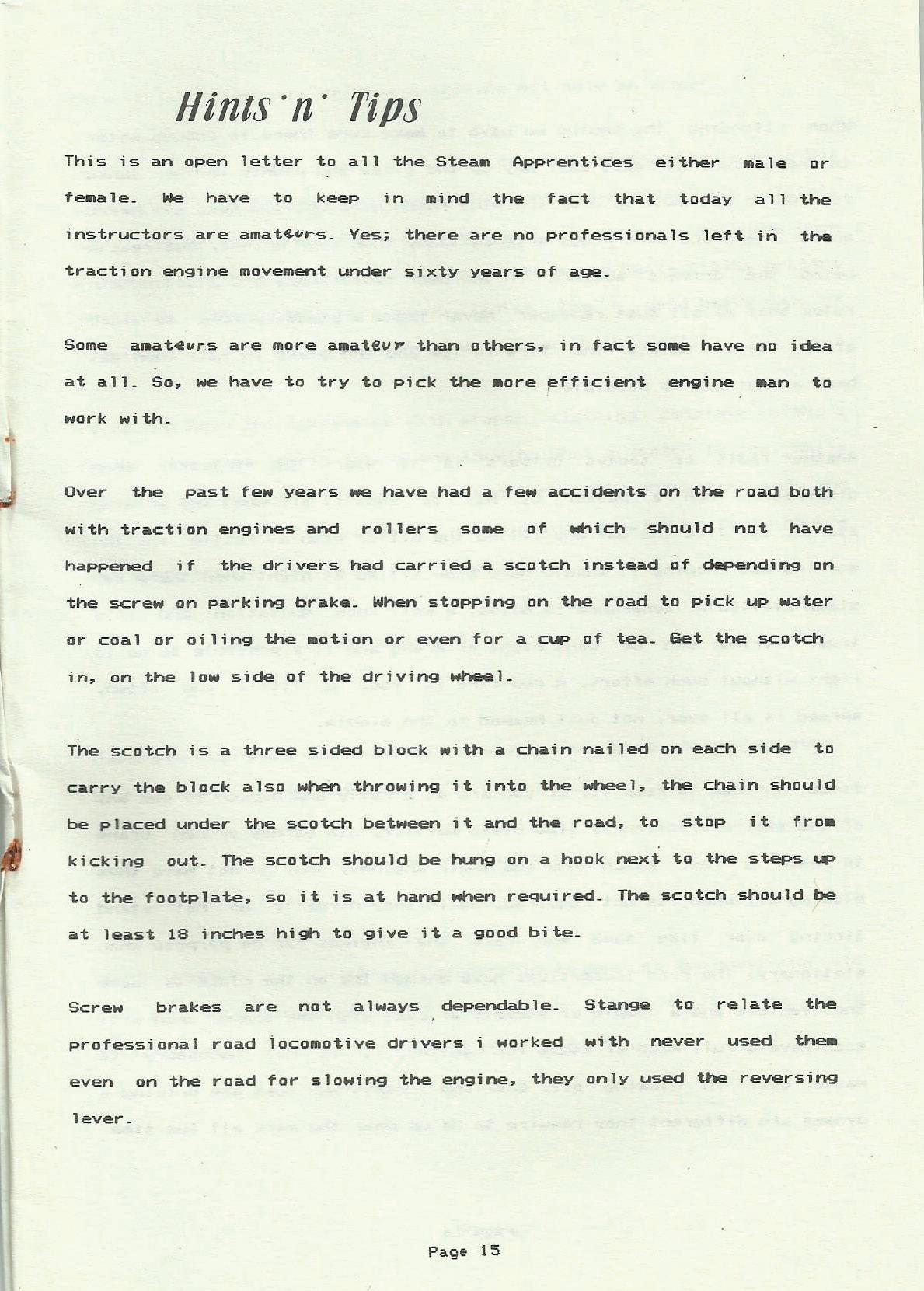 Over the past few years we have had a few accidents on the road both with traction engines and rollers soae of Nhich should not have happened if the drivers had carried~ scotch instead of depending on the screw on parking brake. When stopping on the road to pick up ..ater or coal or oiling the or even for a'CUP of tea. &et the scotch in. on the low side of the drivi09 wheel.